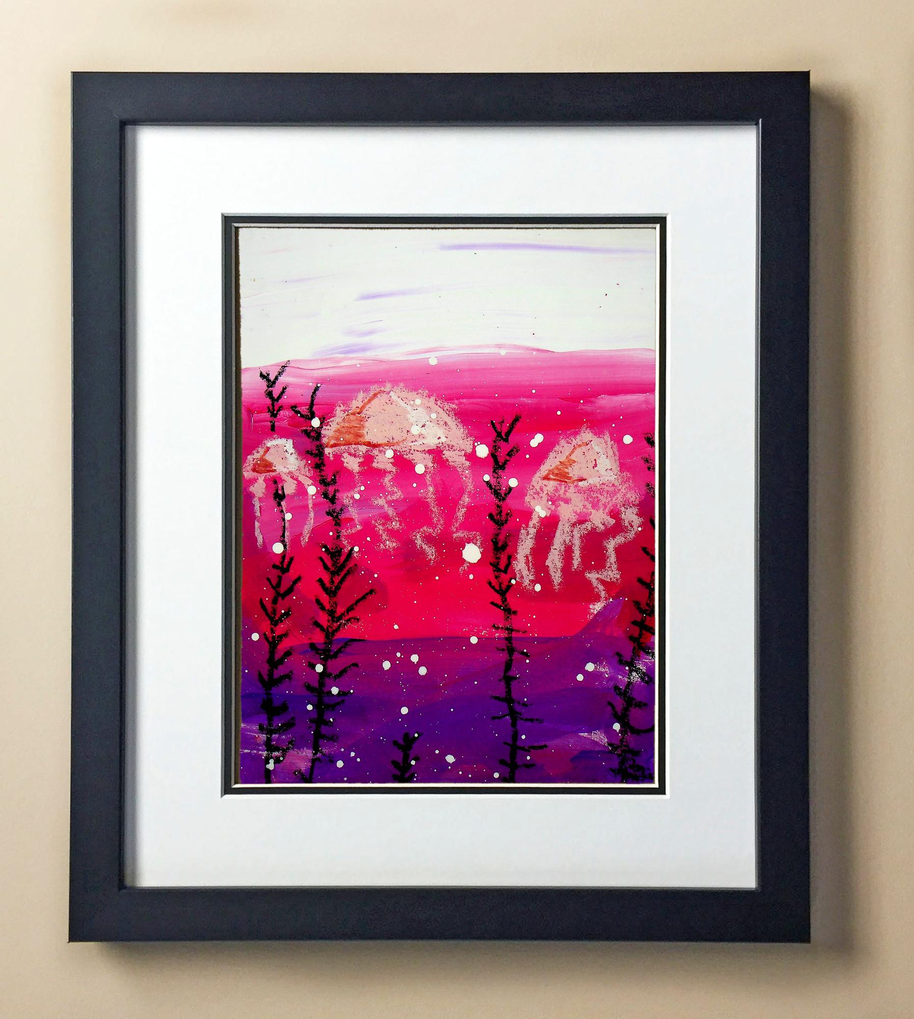 Included with the purchase is the Students Artwork, Frame, double matboard, shatter proof plexiglass, and a ready to hang backerboard with turnbuttons