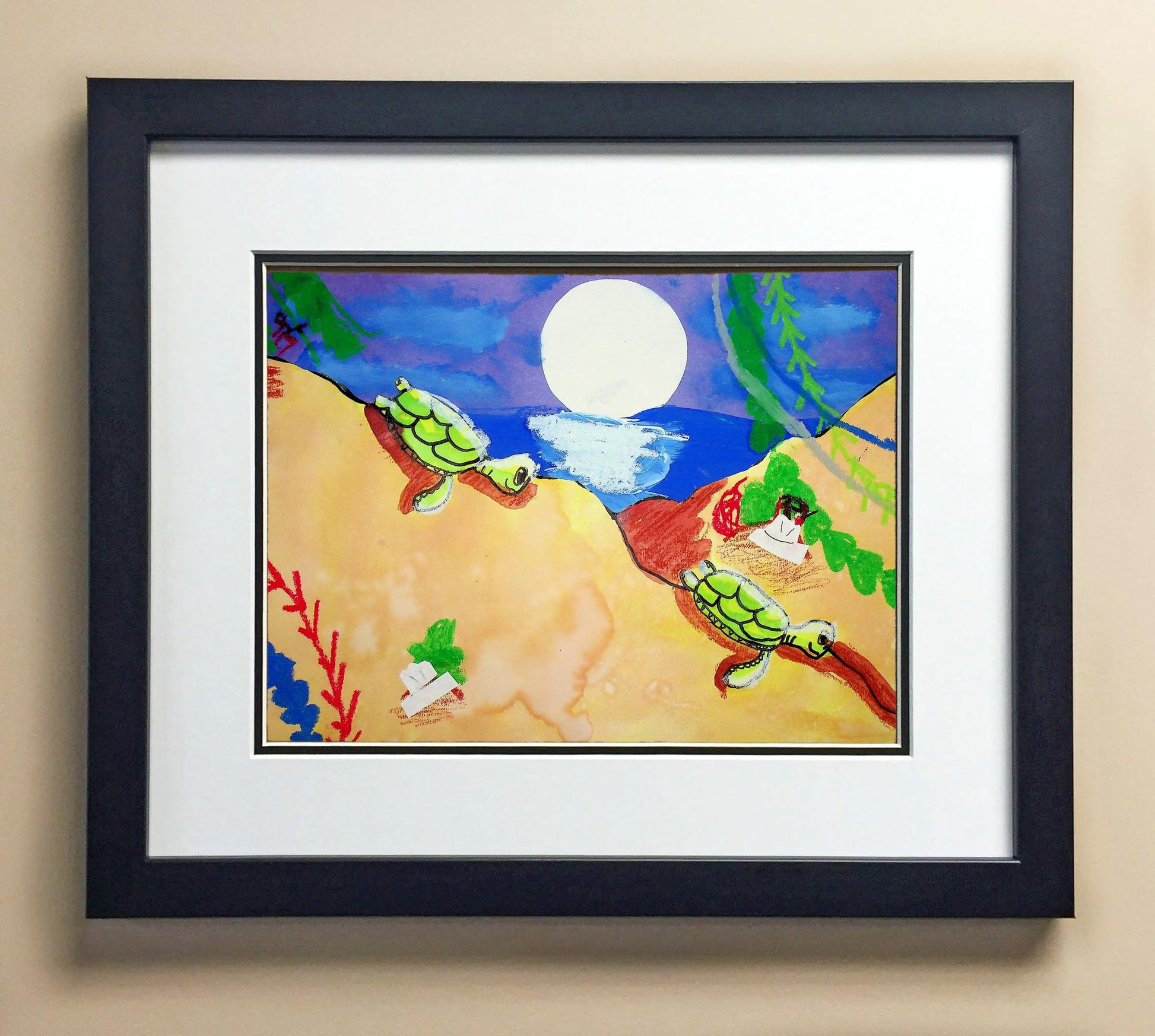 Included with the purchase is the Students Artwork, Frame, double matboard, shatter proof plexiglass, and a ready to hang backerboard with turnbuttons