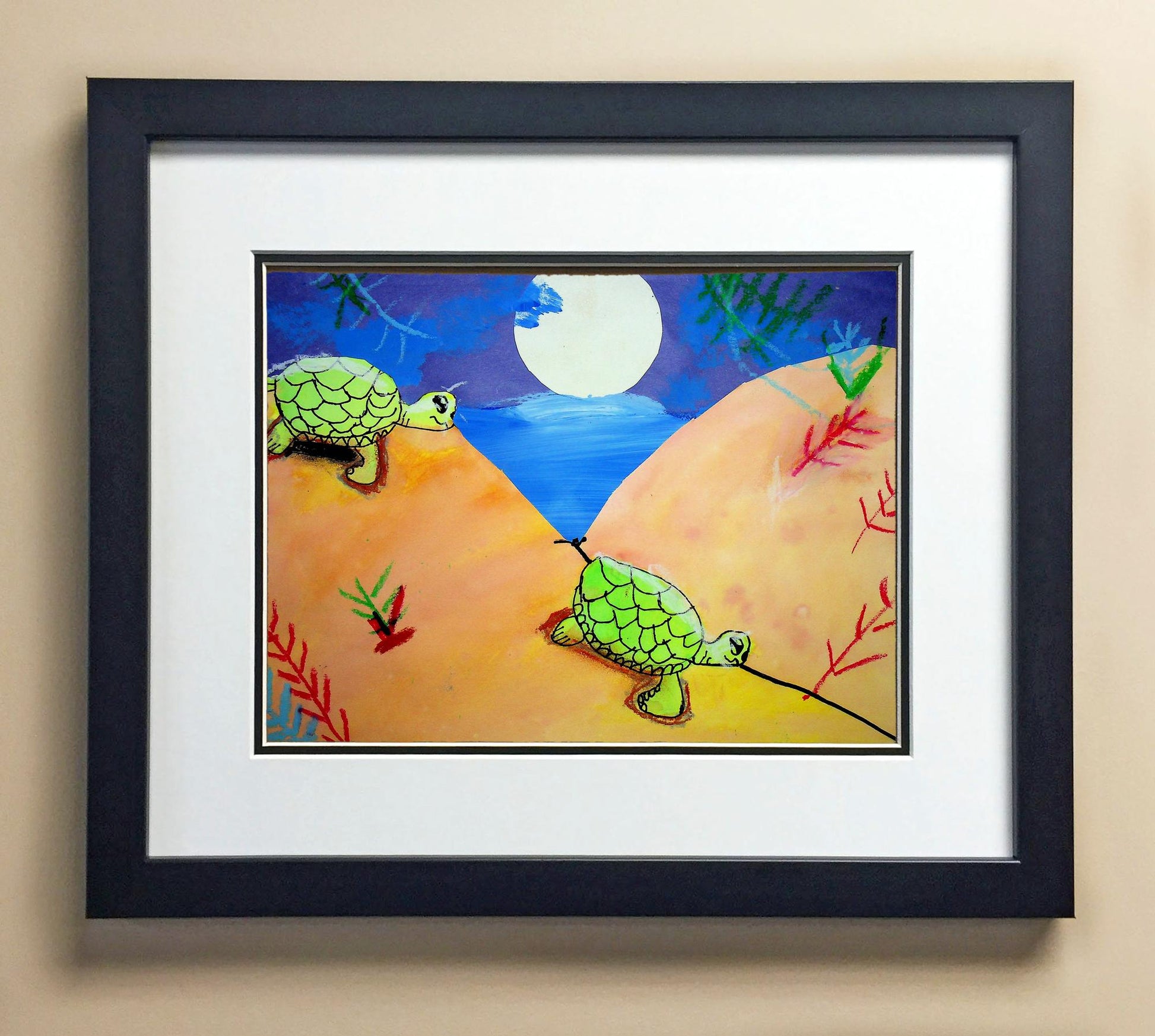 Included with the purchase is the Students Artwork, Frame, double matboard, shatter proof plexiglass, and a ready to hang backerboard with turnbuttons