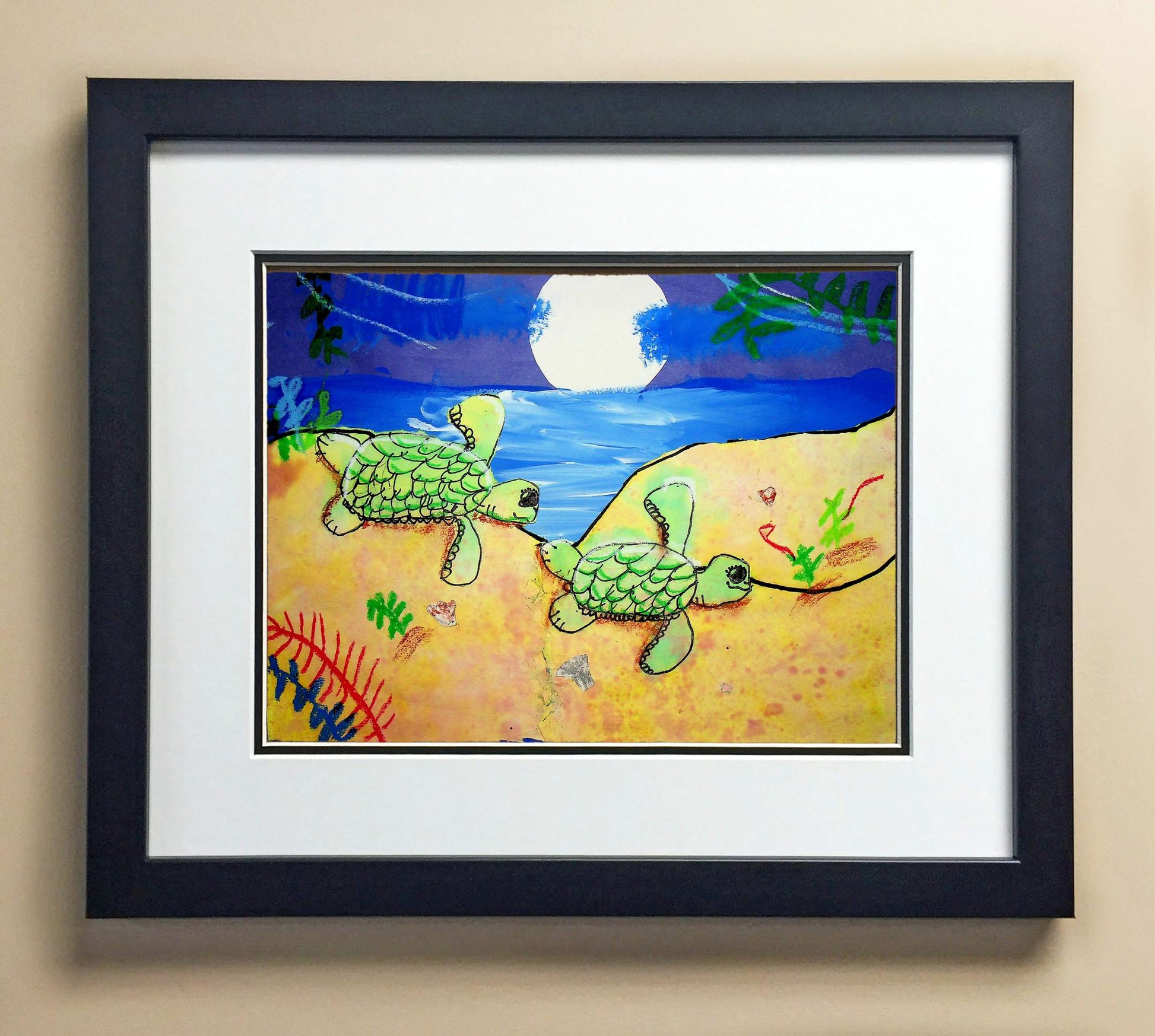 Included with the purchase is the Students Artwork, Frame, double matboard, shatter proof plexiglass, and a ready to hang backerboard with turnbuttons