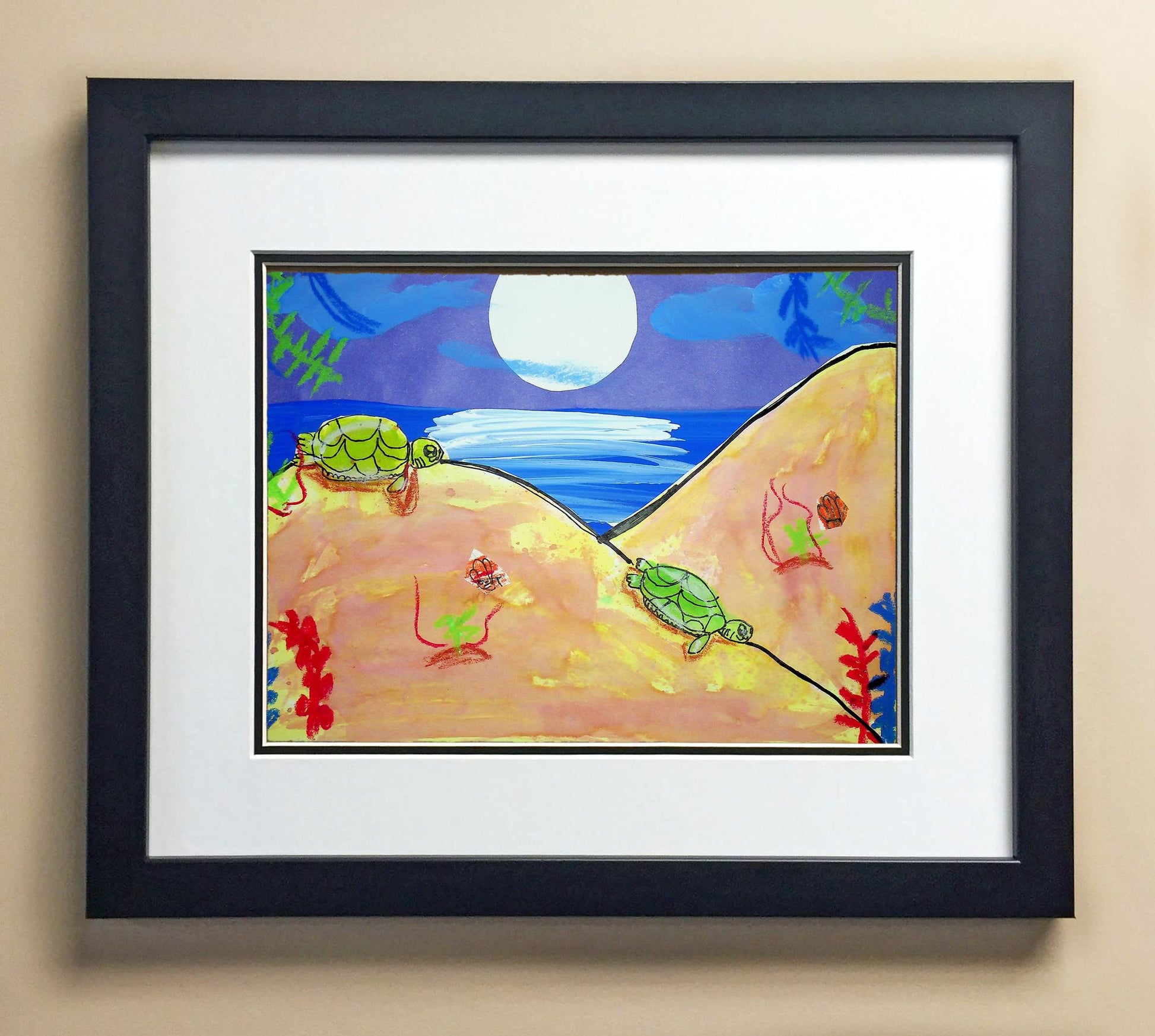 Included with the purchase is the Students Artwork, Frame, double matboard, shatter proof plexiglass, and a ready to hang backerboard with turnbuttons