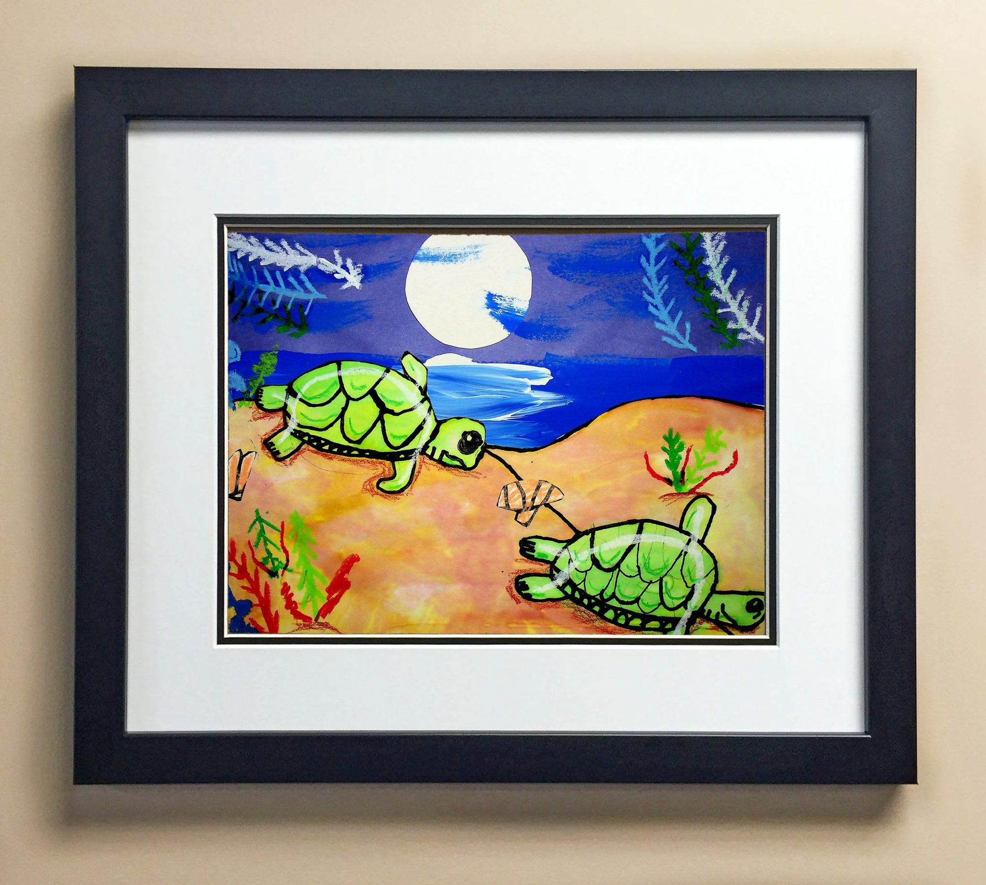Included with the purchase is the Students Artwork, Frame, double matboard, shatter proof plexiglass, and a ready to hang backerboard with turnbuttons