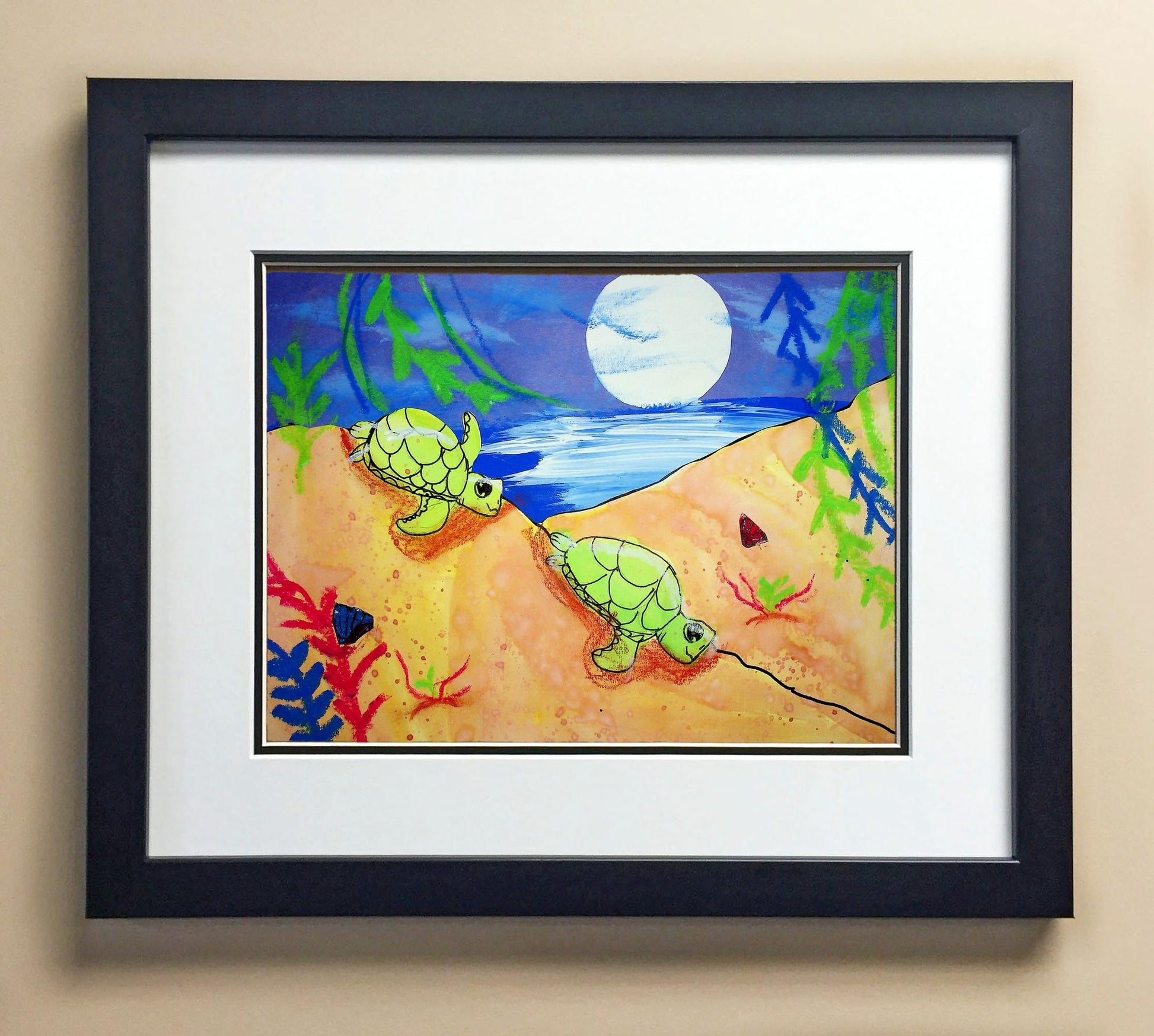 Included with the purchase is the Students Artwork, Frame, double matboard, shatter proof plexiglass, and a ready to hang backerboard with turnbuttons