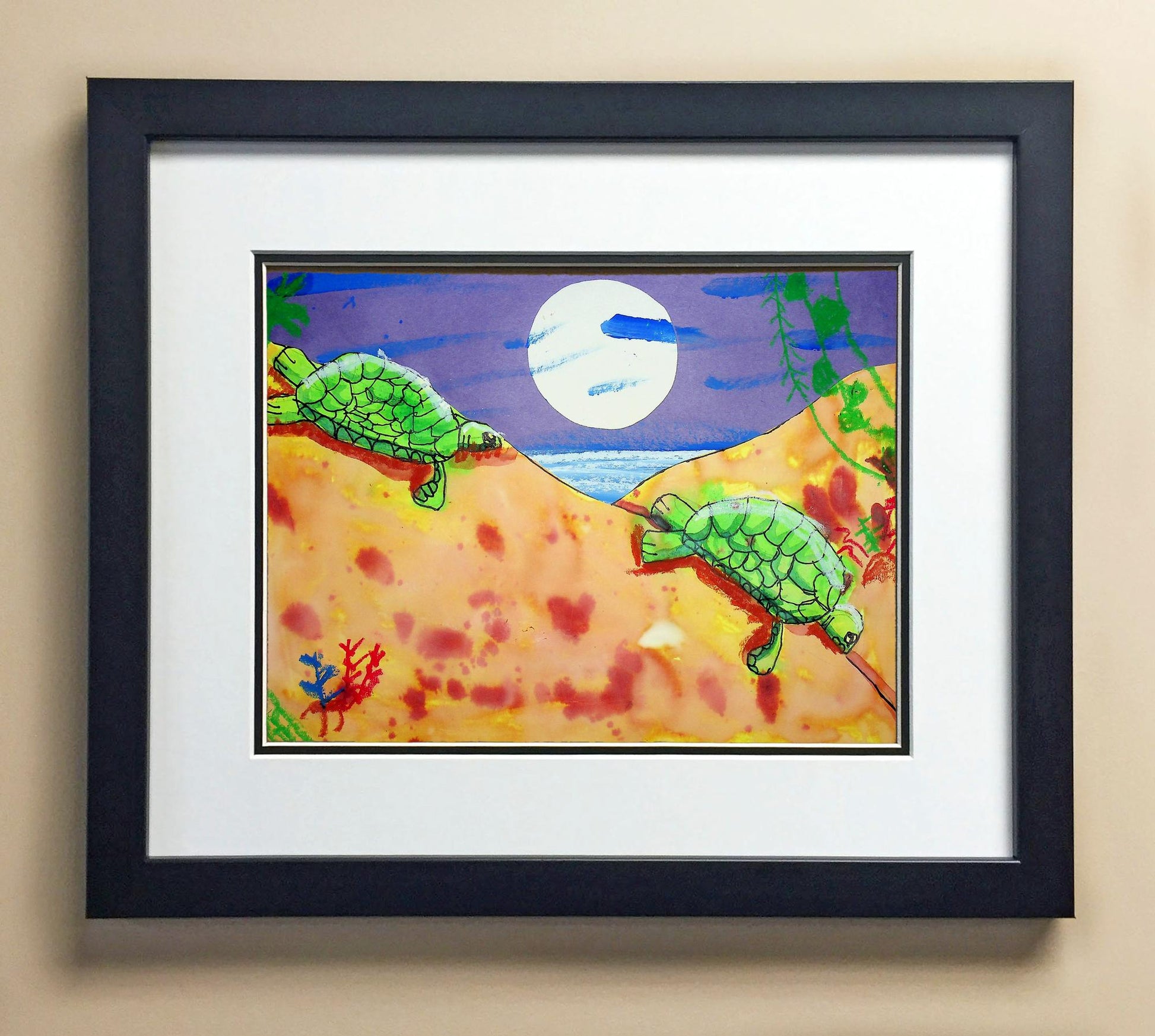 Included with the purchase is the Students Artwork, Frame, double matboard, shatter proof plexiglass, and a ready to hang backerboard with turnbuttons