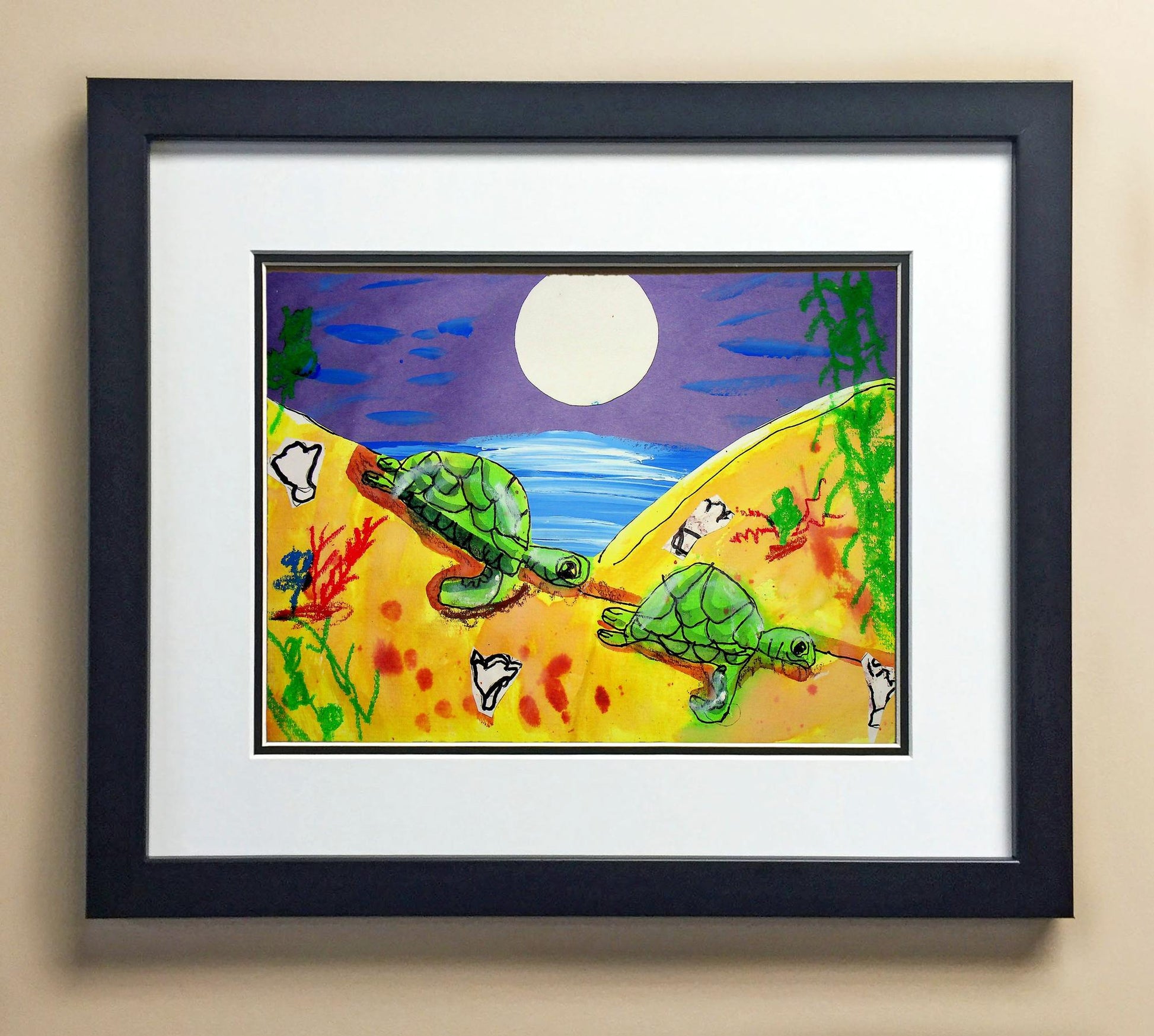 Included with the purchase is the Students Artwork, Frame, double matboard, shatter proof plexiglass, and a ready to hang backerboard with turnbuttons
