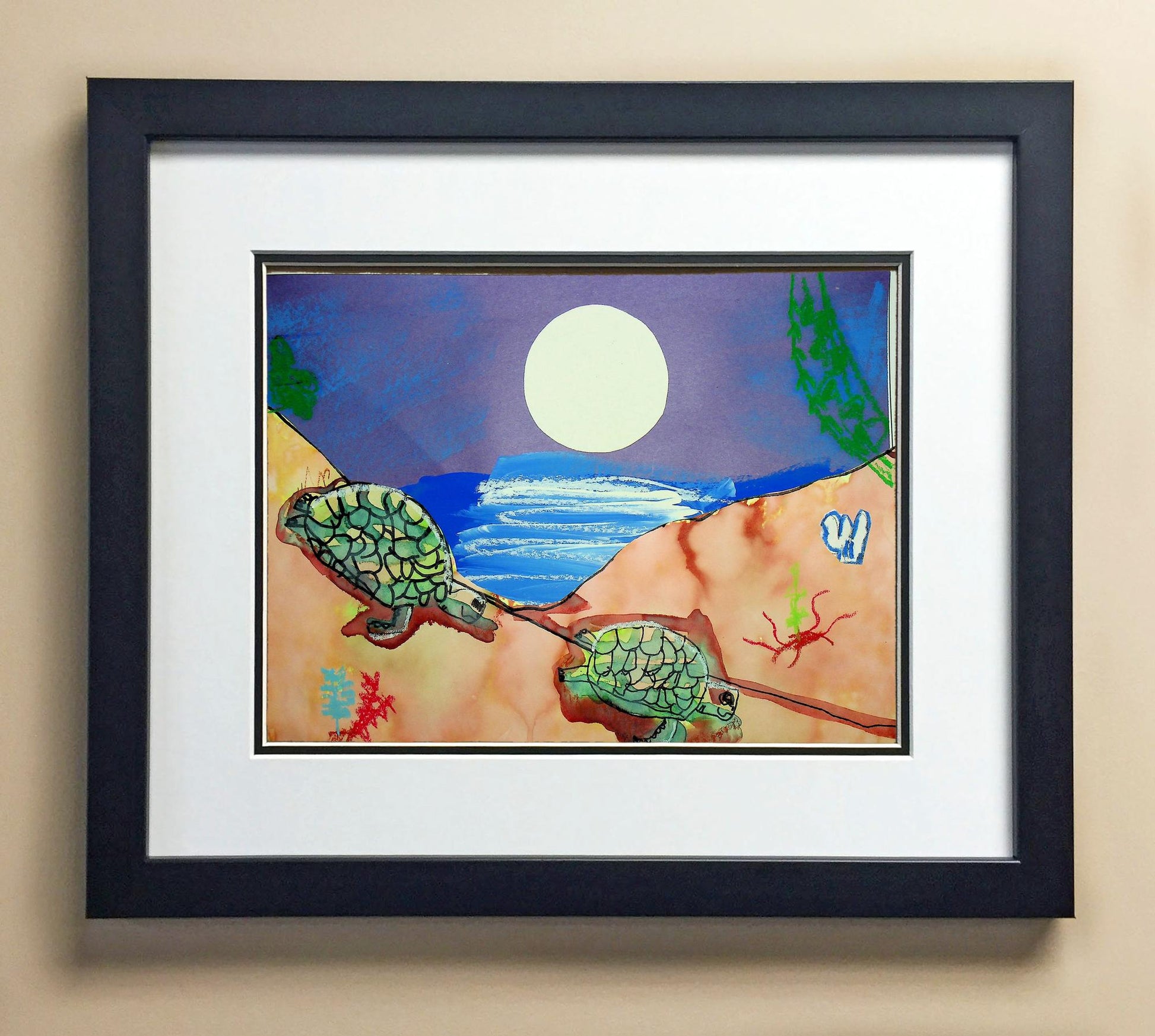 Included with the purchase is the Students Artwork, Frame, double matboard, shatter proof plexiglass, and a ready to hang backerboard with turnbuttons