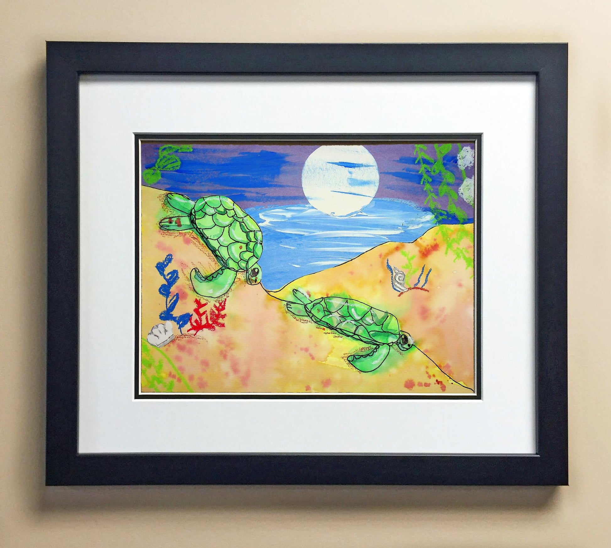 Included with the purchase is the Students Artwork, Frame, double matboard, shatter proof plexiglass, and a ready to hang backerboard with turnbuttons