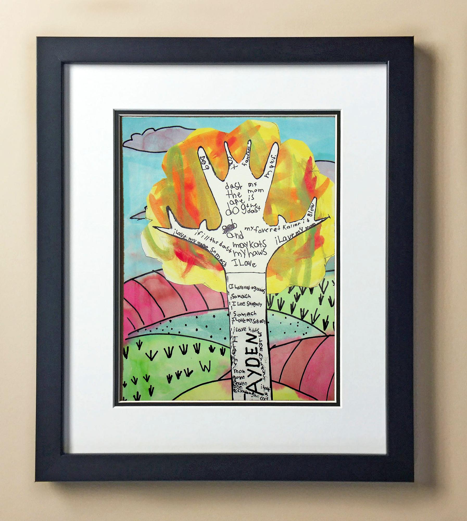 Included with the purchase is the Students Artwork, Frame, double matboard, shatter proof plexiglass, and a ready to hang backerboard with turnbuttons