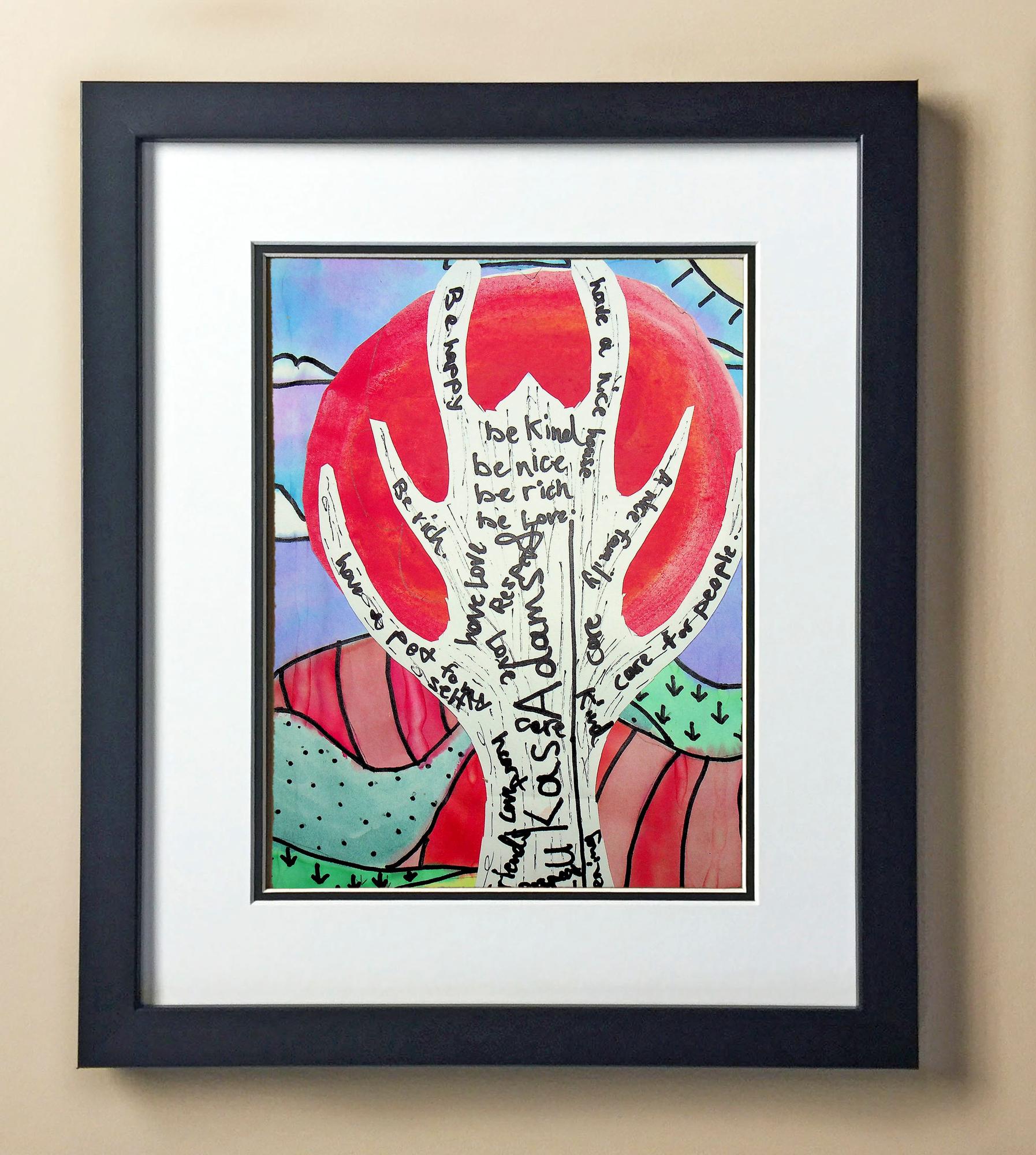 Included with the purchase is the Students Artwork, Frame, double matboard, shatter proof plexiglass, and a ready to hang backerboard with turnbuttons