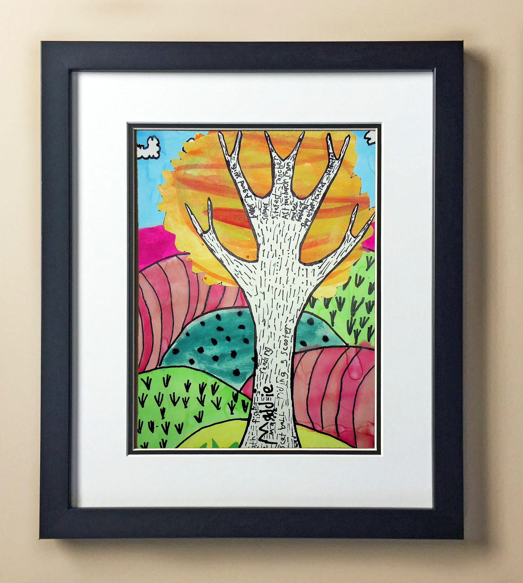 Included with the purchase is the Students Artwork, Frame, double matboard, shatter proof plexiglass, and a ready to hang backerboard with turnbuttons