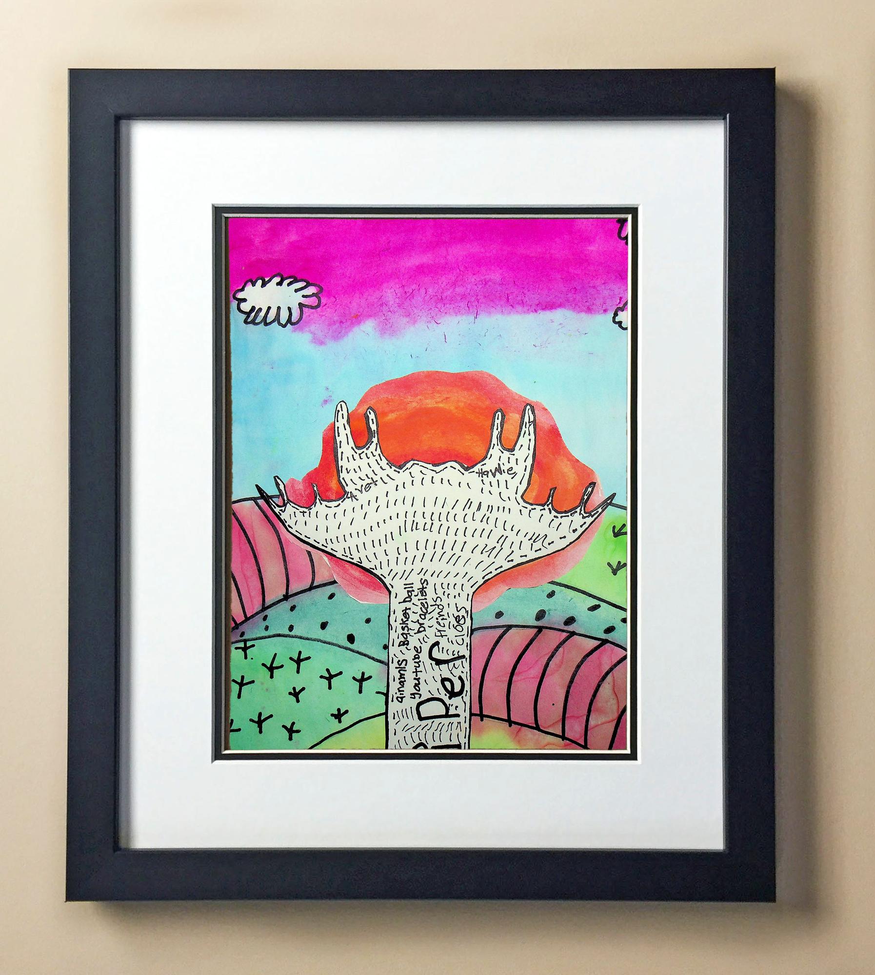Included with the purchase is the Students Artwork, Frame, double matboard, shatter proof plexiglass, and a ready to hang backerboard with turnbuttons