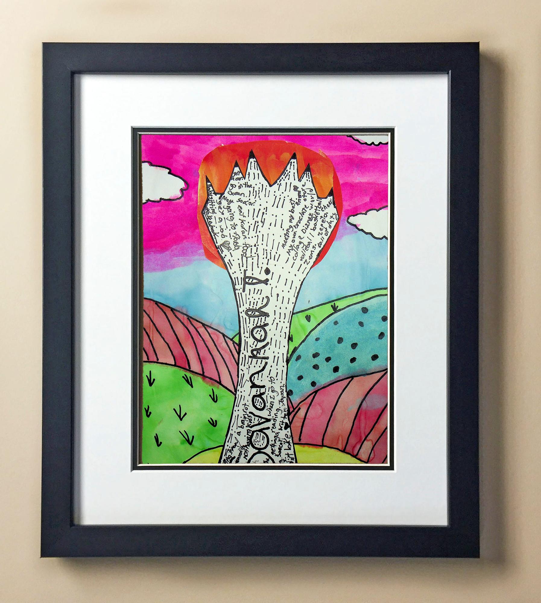 Included with the purchase is the Students Artwork, Frame, double matboard, shatter proof plexiglass, and a ready to hang backerboard with turnbuttons