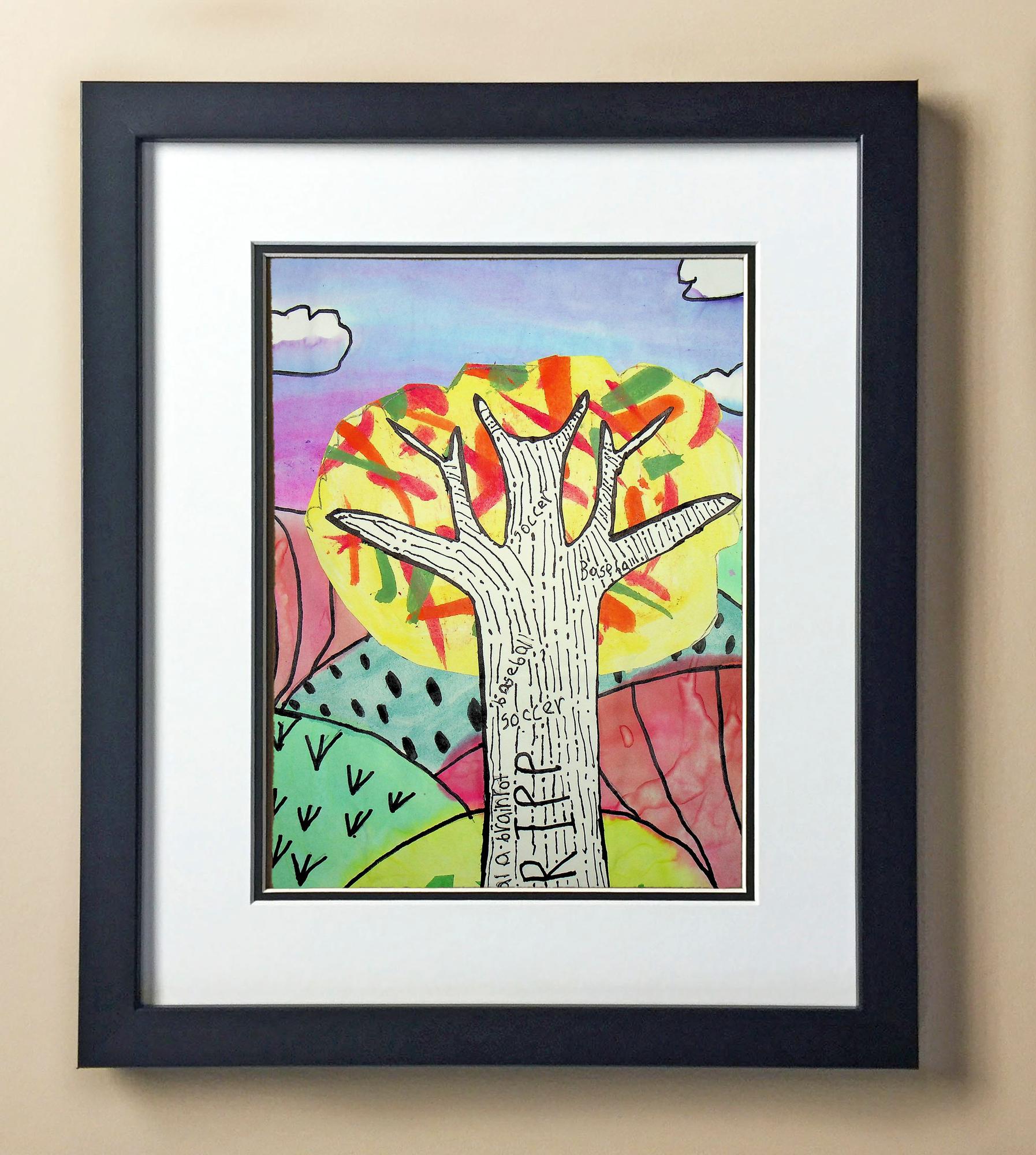 Included with the purchase is the Students Artwork, Frame, double matboard, shatter proof plexiglass, and a ready to hang backerboard with turnbuttons