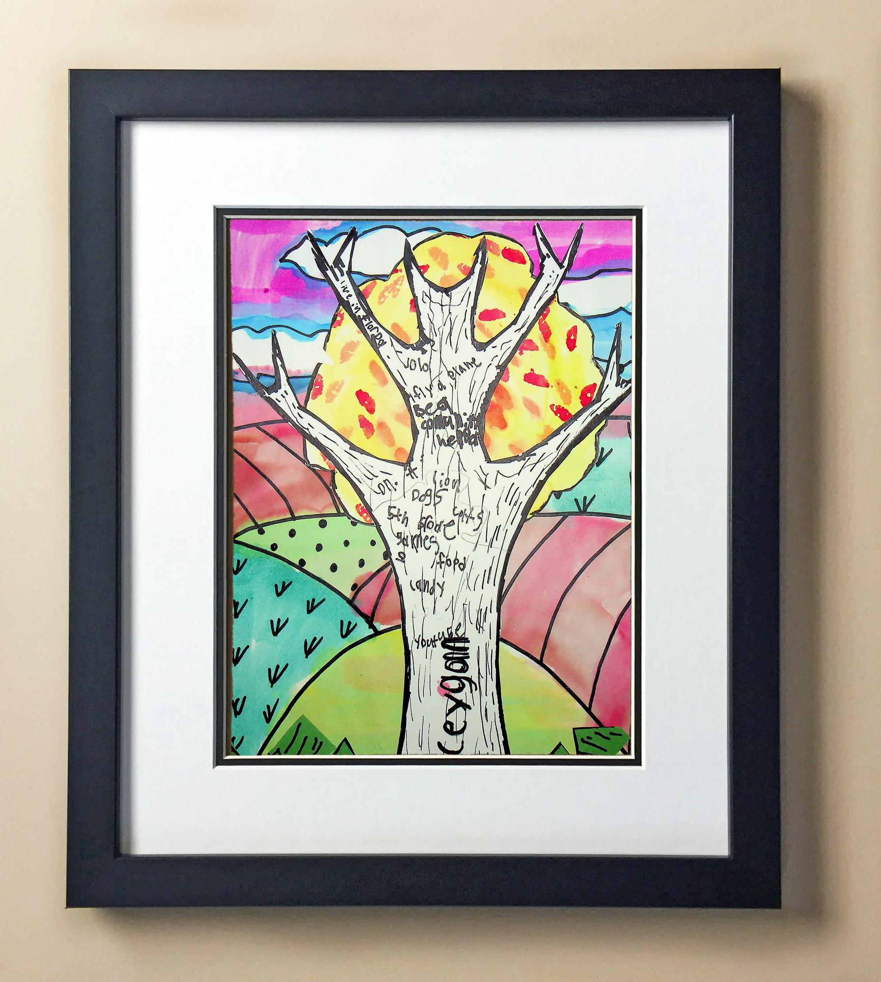 Included with the purchase is the Students Artwork, Frame, double matboard, shatter proof plexiglass, and a ready to hang backerboard with turnbuttons