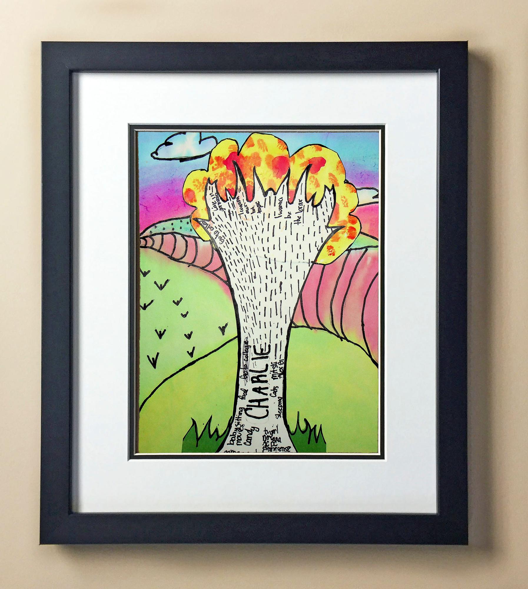 Included with the purchase is the Students Artwork, Frame, double matboard, shatter proof plexiglass, and a ready to hang backerboard with turnbuttons