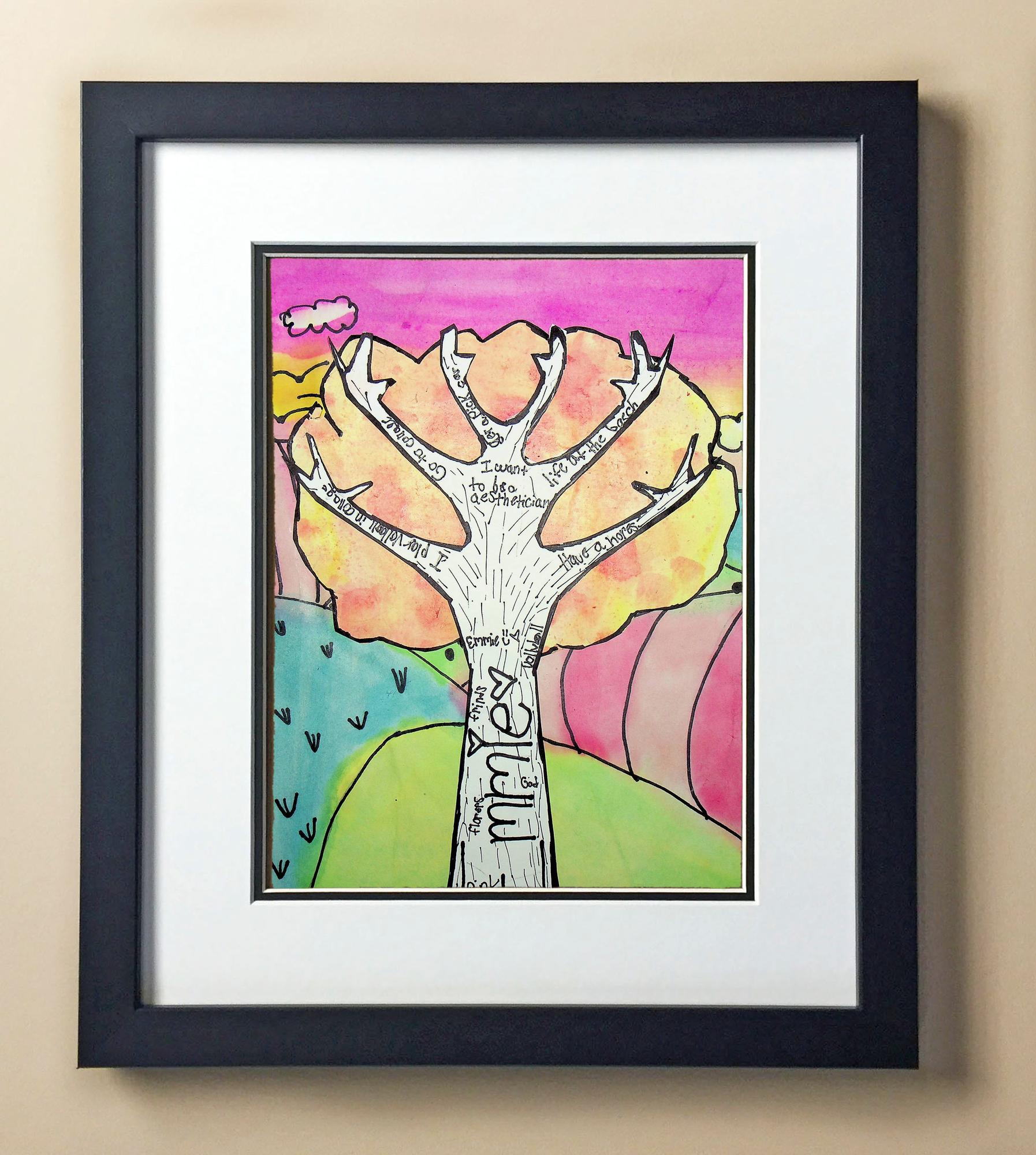 Included with the purchase is the Students Artwork, Frame, double matboard, shatter proof plexiglass, and a ready to hang backerboard with turnbuttons