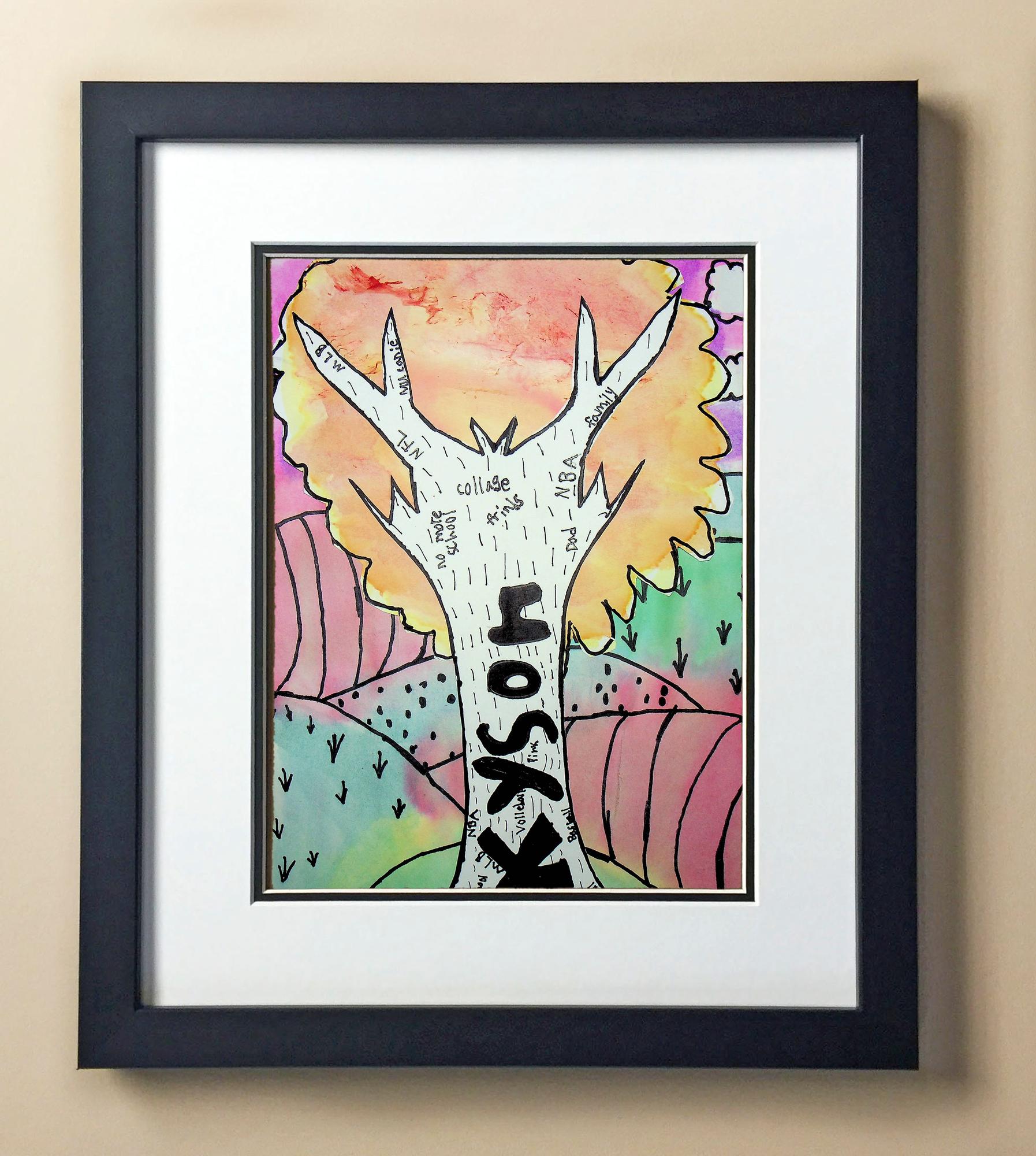 Included with the purchase is the Students Artwork, Frame, double matboard, shatter proof plexiglass, and a ready to hang backerboard with turnbuttons