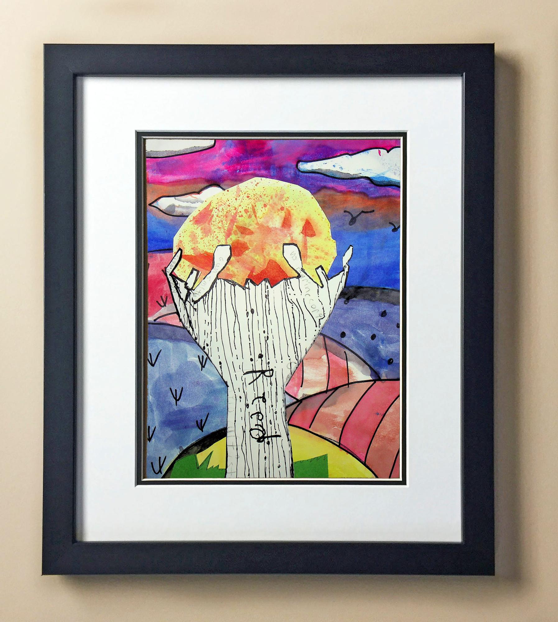 Included with the purchase is the Students Artwork, Frame, double matboard, shatter proof plexiglass, and a ready to hang backerboard with turnbuttons