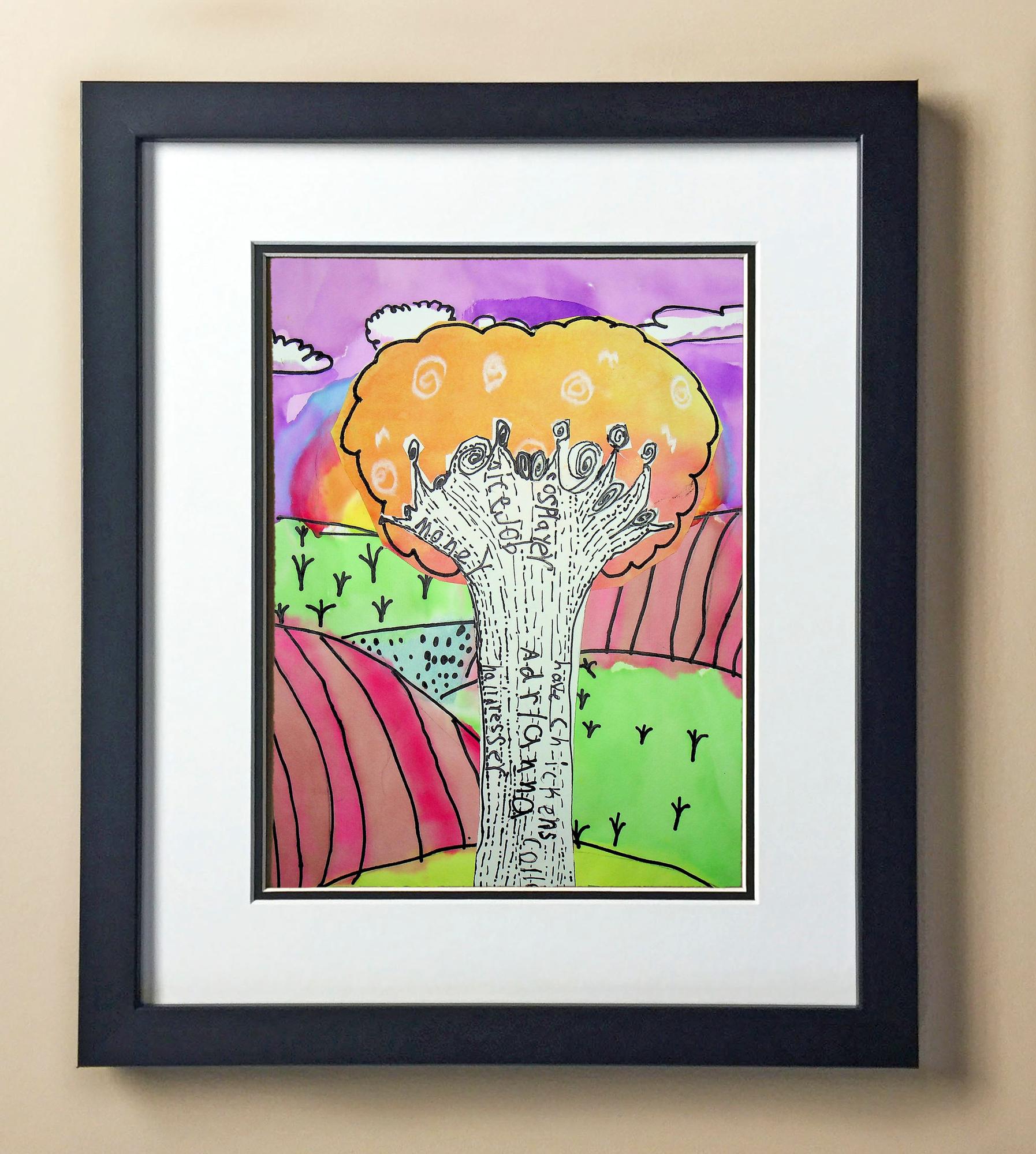 Included with the purchase is the Students Artwork, Frame, double matboard, shatter proof plexiglass, and a ready to hang backerboard with turnbuttons