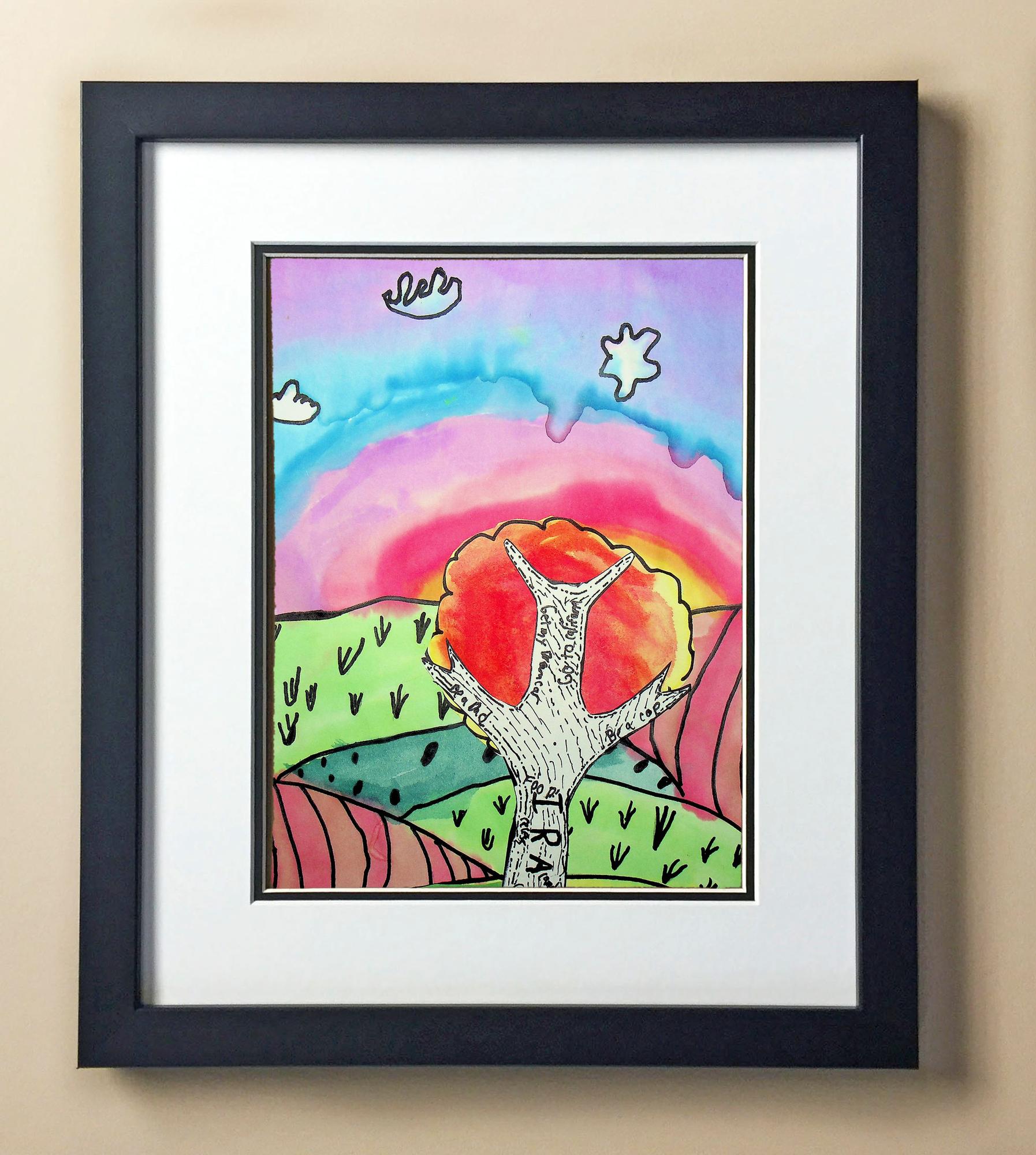 Included with the purchase is the Students Artwork, Frame, double matboard, shatter proof plexiglass, and a ready to hang backerboard with turnbuttons