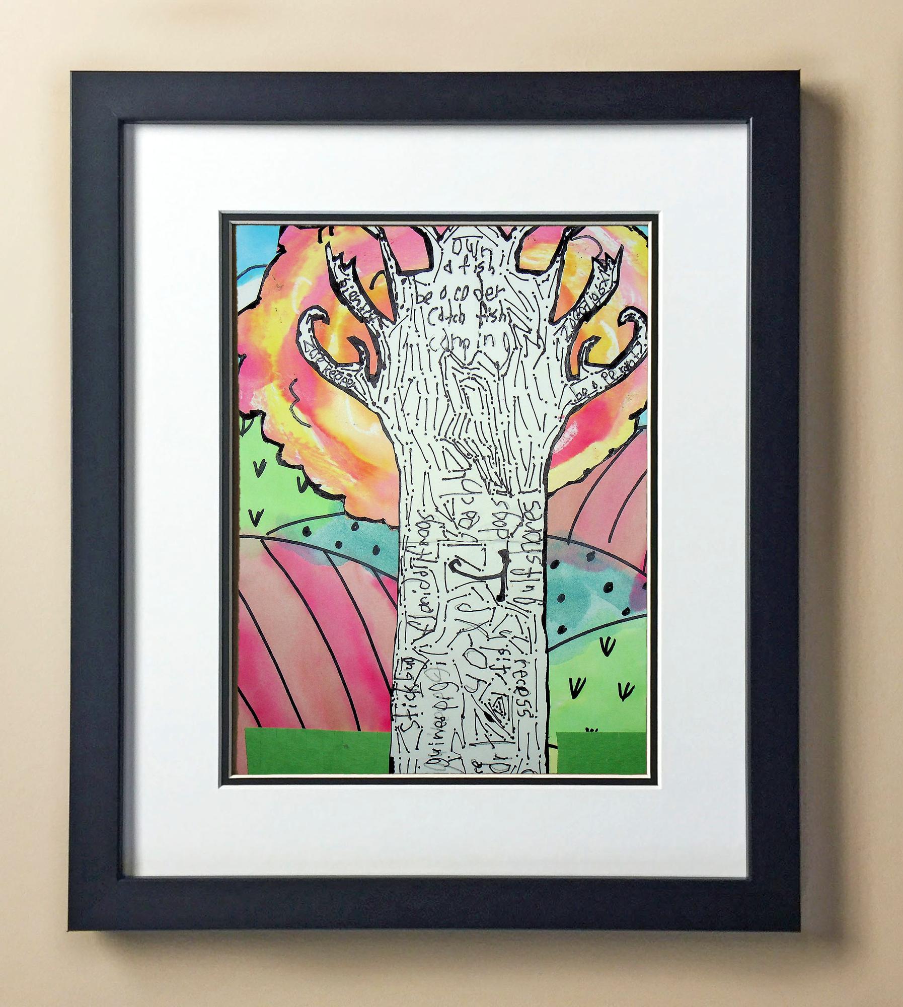 Included with the purchase is the Students Artwork, Frame, double matboard, shatter proof plexiglass, and a ready to hang backerboard with turnbuttons