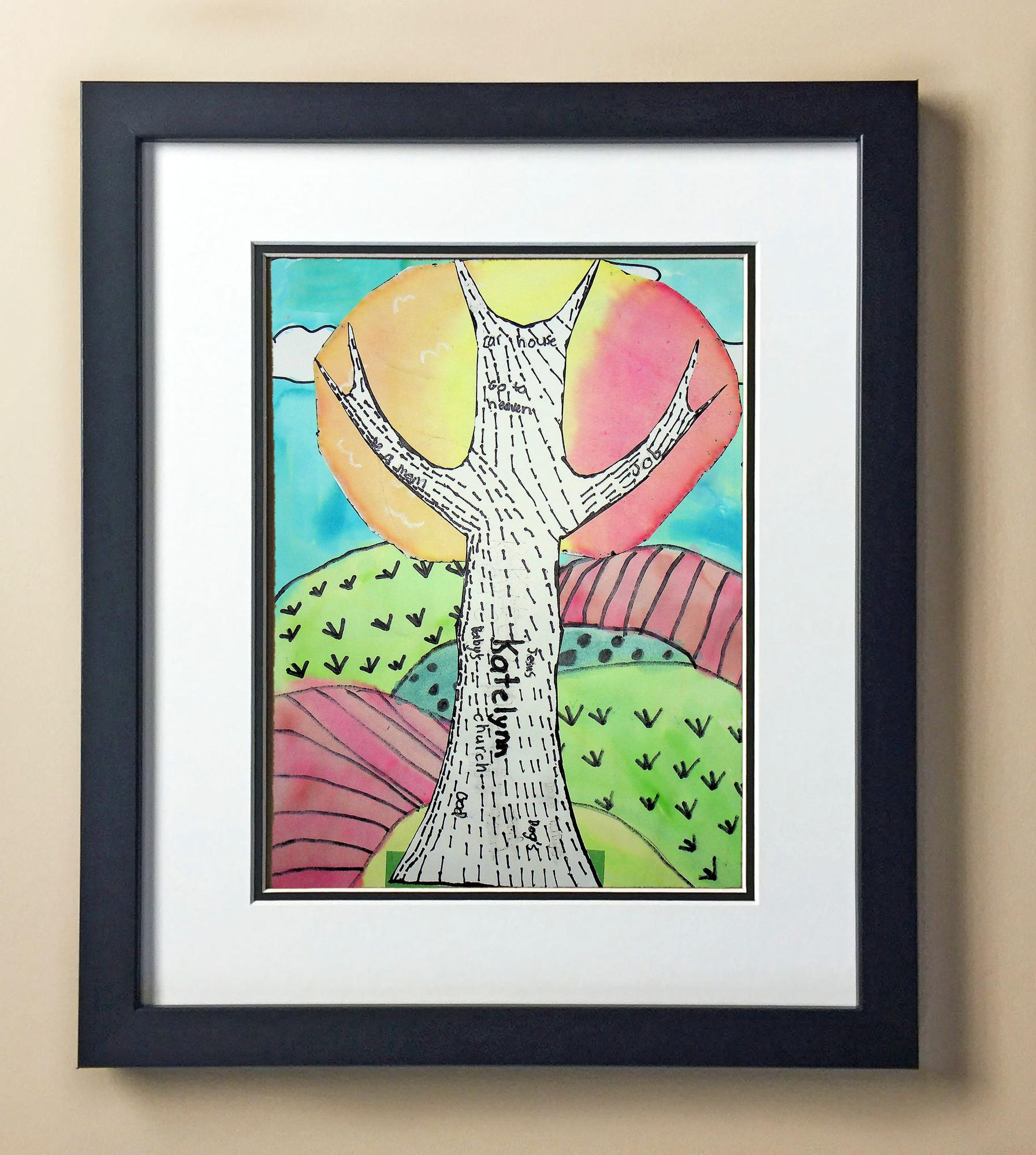 Included with the purchase is the Students Artwork, Frame, double matboard, shatter proof plexiglass, and a ready to hang backerboard with turnbuttons