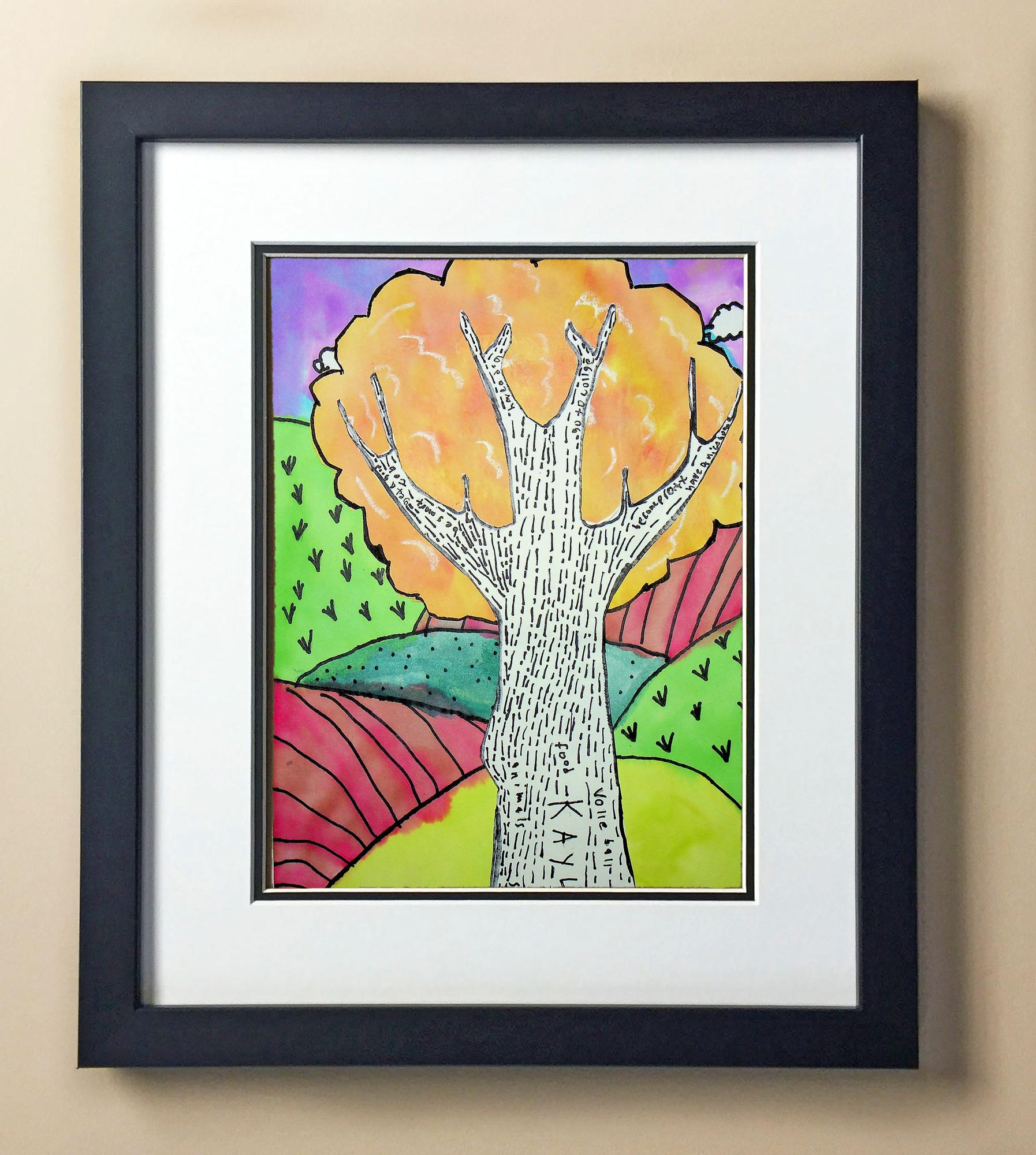 Included with the purchase is the Students Artwork, Frame, double matboard, shatter proof plexiglass, and a ready to hang backerboard with turnbuttons
