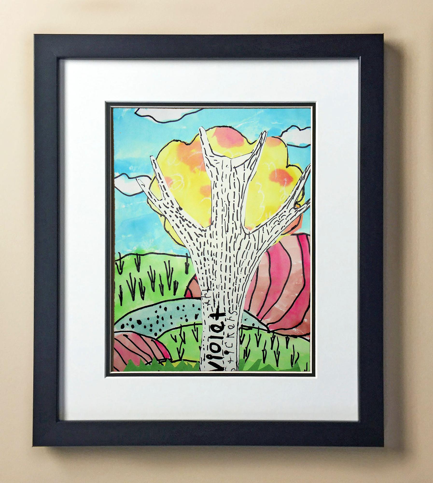 Included with the purchase is the Students Artwork, Frame, double matboard, shatter proof plexiglass, and a ready to hang backerboard with turnbuttons
