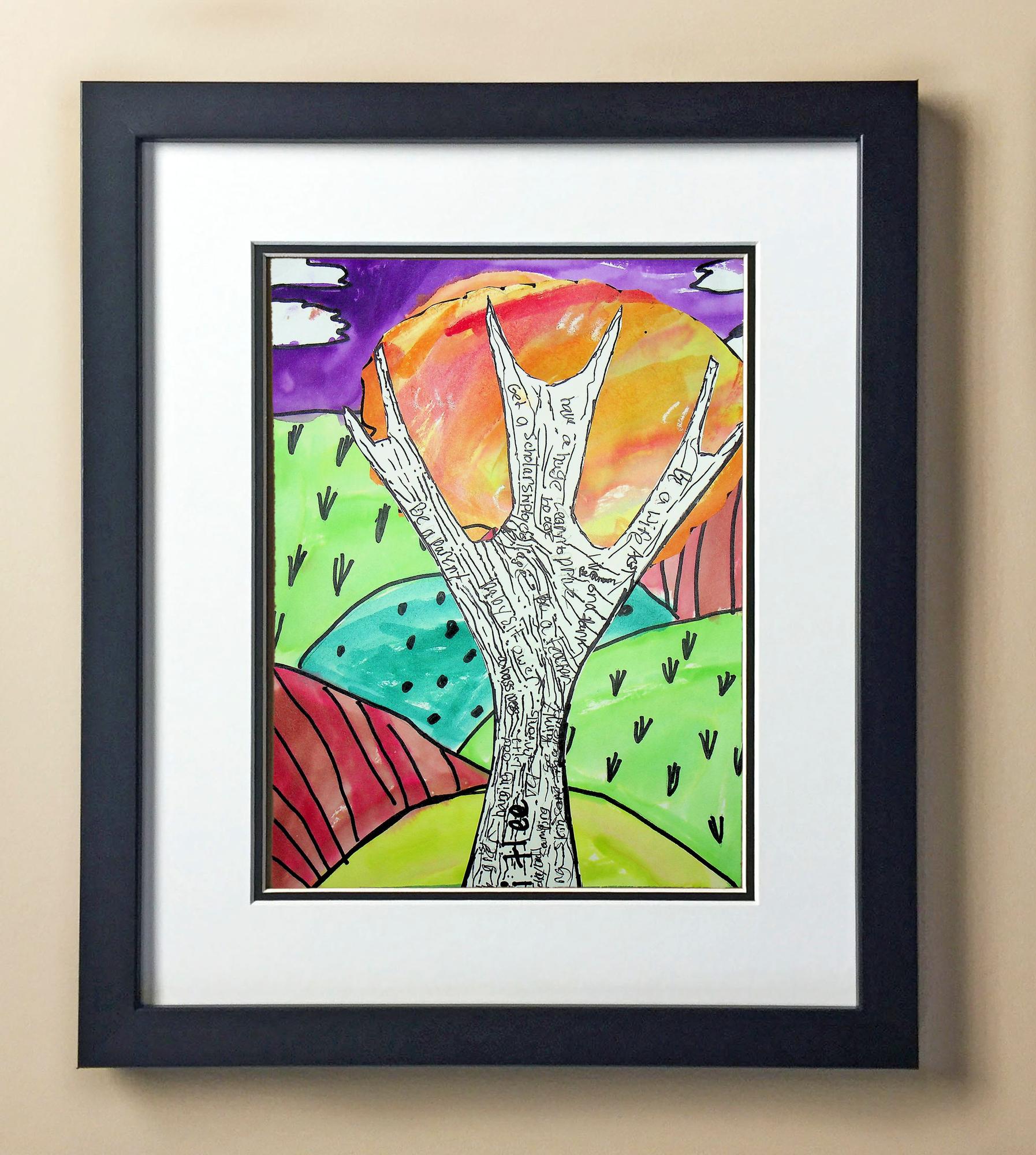 Included with the purchase is the Students Artwork, Frame, double matboard, shatter proof plexiglass, and a ready to hang backerboard with turnbuttons
