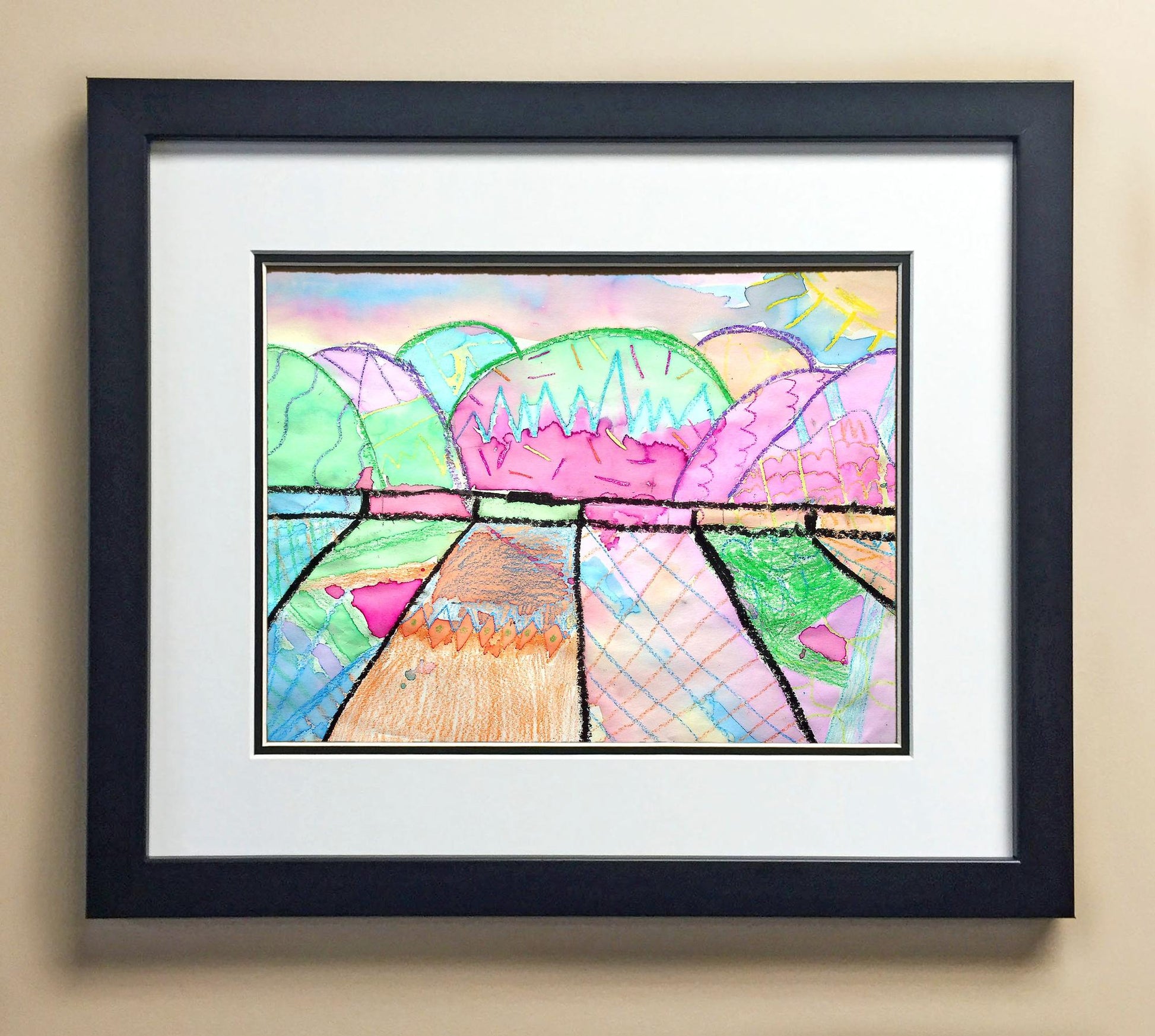 Included with the purchase is the Students Artwork, Frame, double matboard, shatter proof plexiglass, and a ready to hang backerboard with turnbuttons