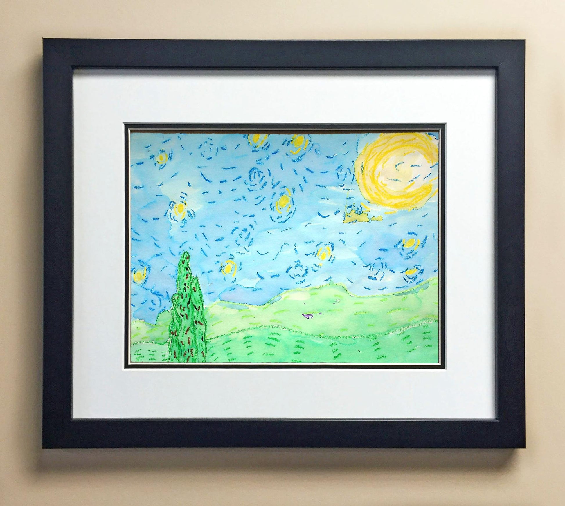 Included with the purchase is the Students Artwork, Frame, double matboard, shatter proof plexiglass, and a ready to hang backerboard with turnbuttons