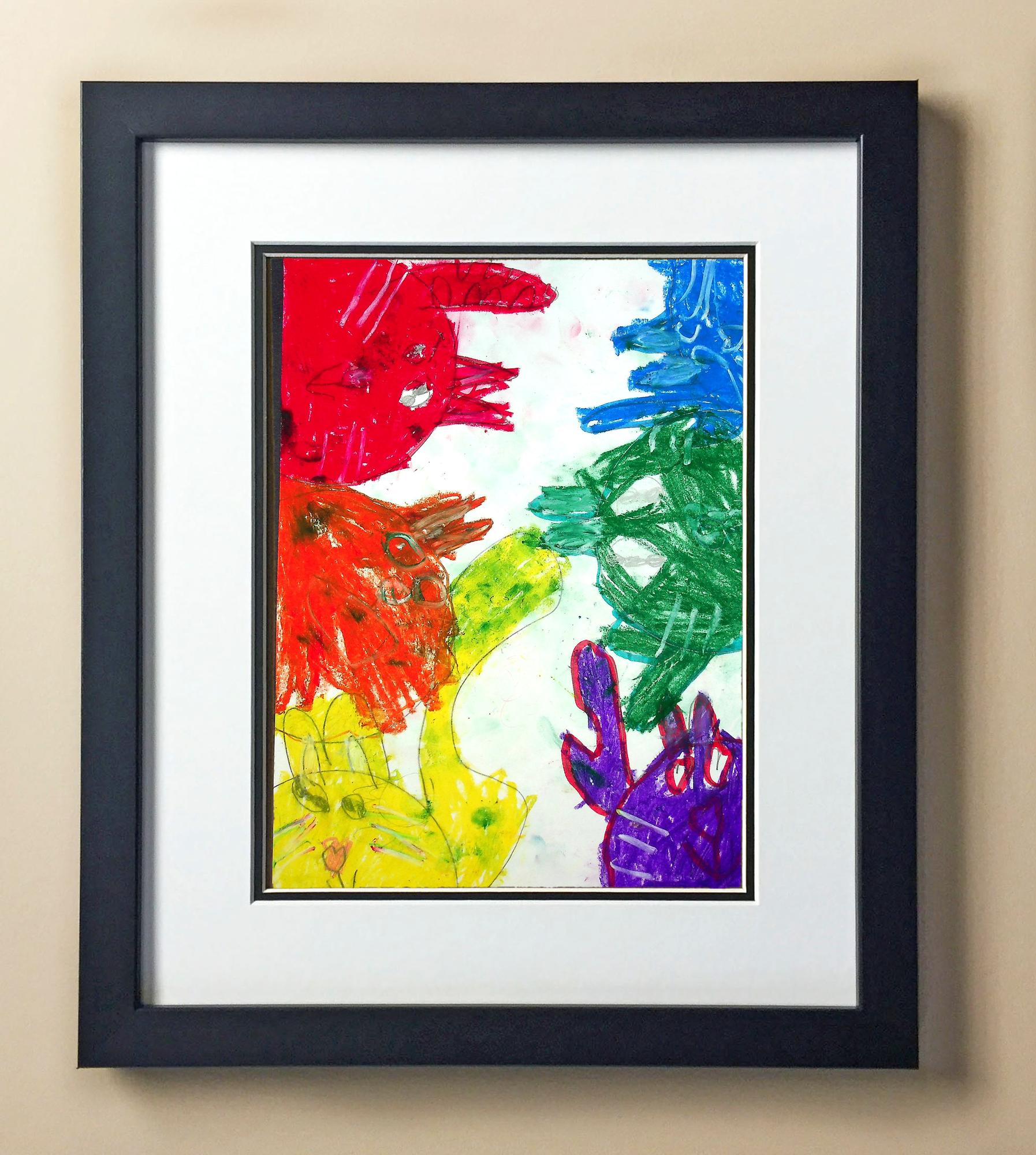 Included with the purchase is the Students Artwork, Frame, double matboard, shatter proof plexiglass, and a ready to hang backerboard with turnbuttons