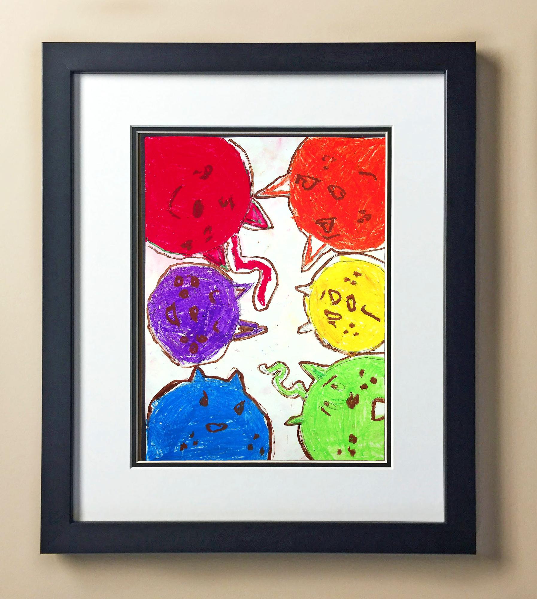 Included with the purchase is the Students Artwork, Frame, double matboard, shatter proof plexiglass, and a ready to hang backerboard with turnbuttons