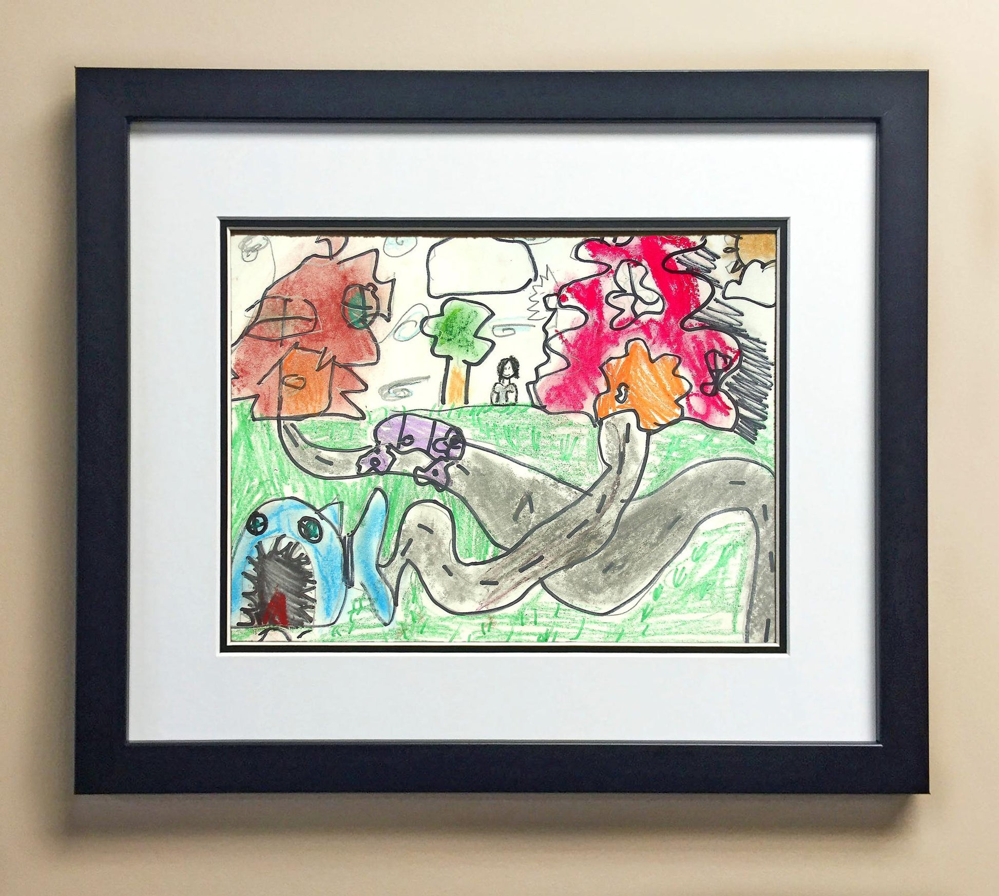 Included with the purchase is the Students Artwork, Frame, double matboard, shatter proof plexiglass, and a ready to hang backerboard with turnbuttons