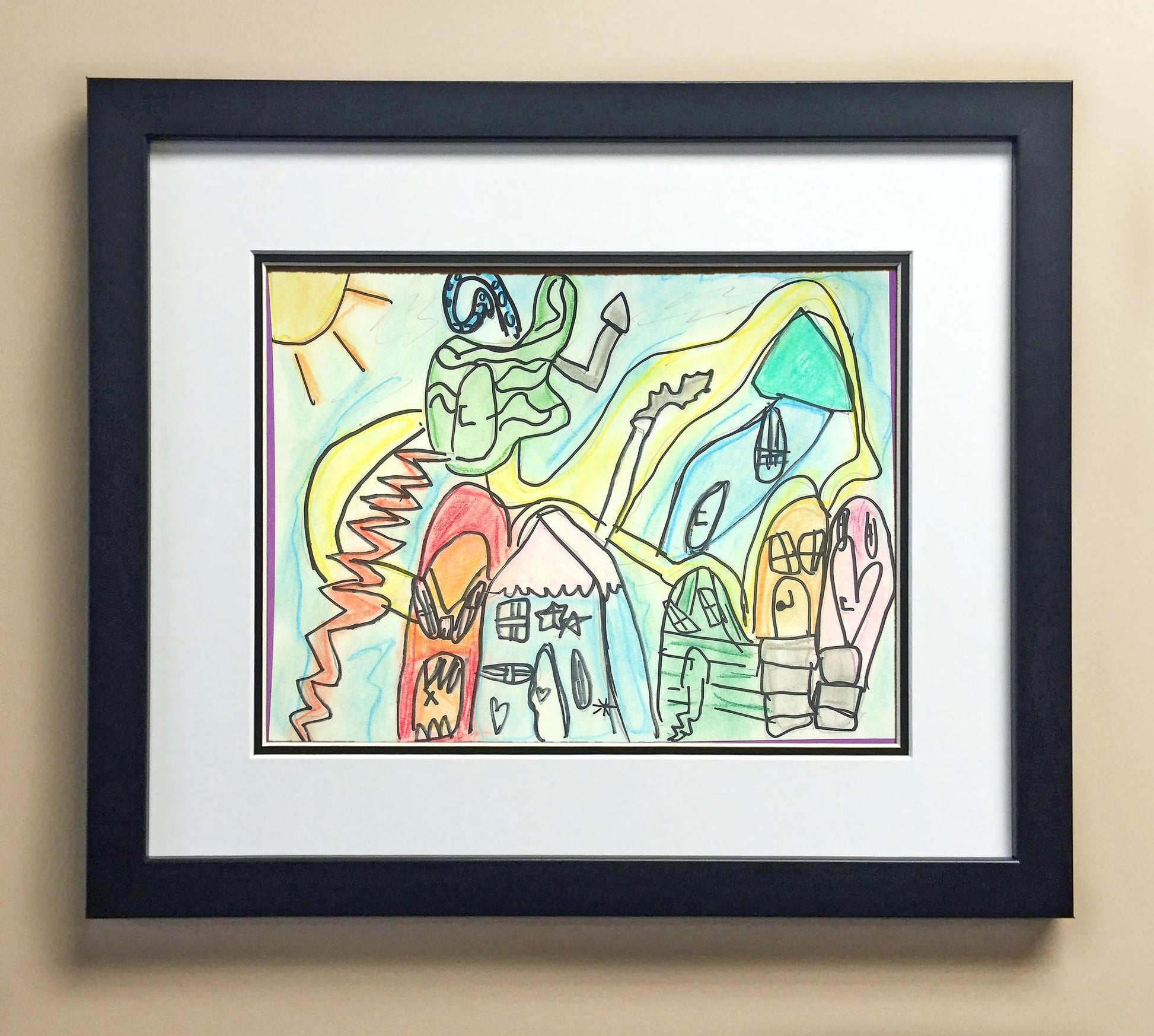Included with the purchase is the Students Artwork, Frame, double matboard, shatter proof plexiglass, and a ready to hang backerboard with turnbuttons