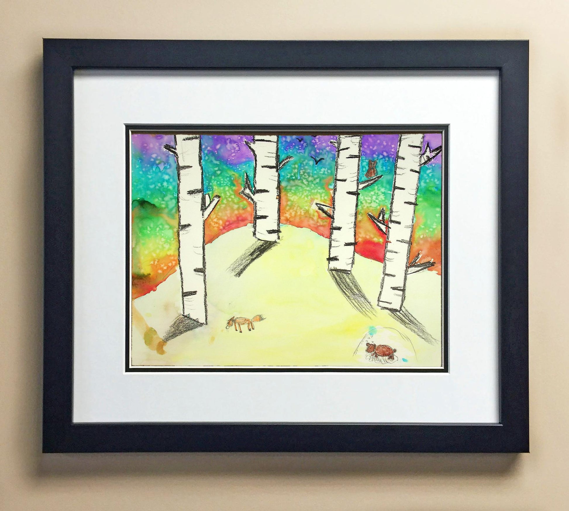 Included with the purchase is the Students Artwork, Frame, double matboard, shatter proof plexiglass, and a ready to hang backerboard with turnbuttons