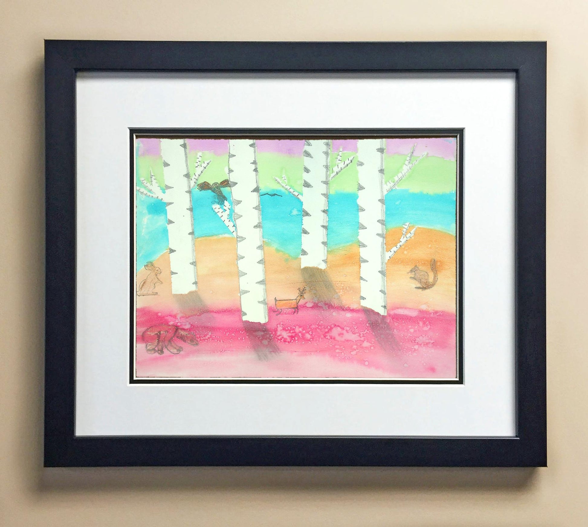 Included with the purchase is the Students Artwork, Frame, double matboard, shatter proof plexiglass, and a ready to hang backerboard with turnbuttons