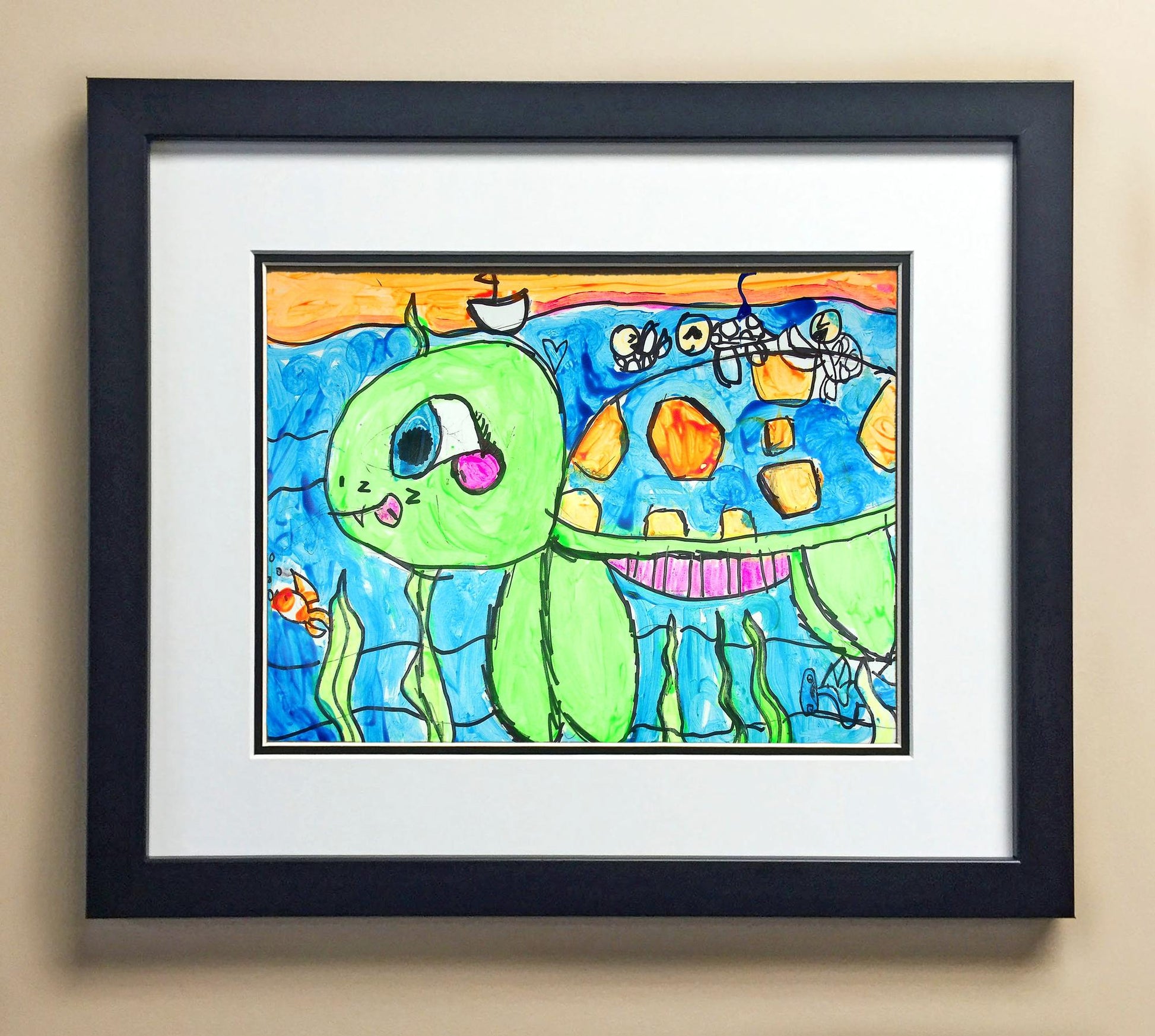 Included with the purchase is the Students Artwork, Frame, double matboard, shatter proof plexiglass, and a ready to hang backerboard with turnbuttons