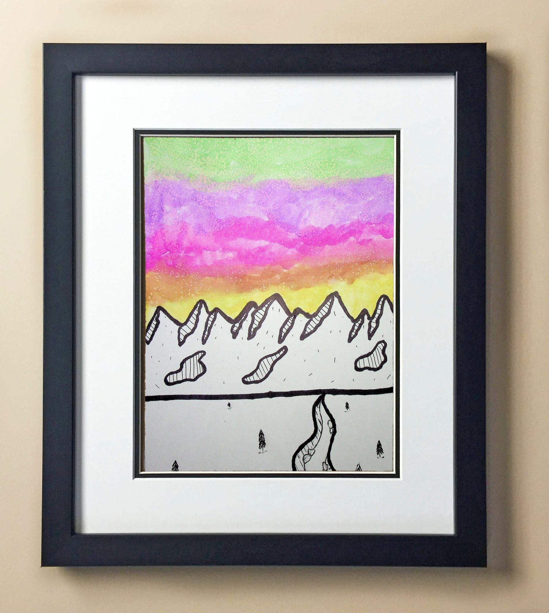 Included with the purchase is the Students Artwork, Frame, double matboard, shatter proof plexiglass, and a ready to hang backerboard with turnbuttons