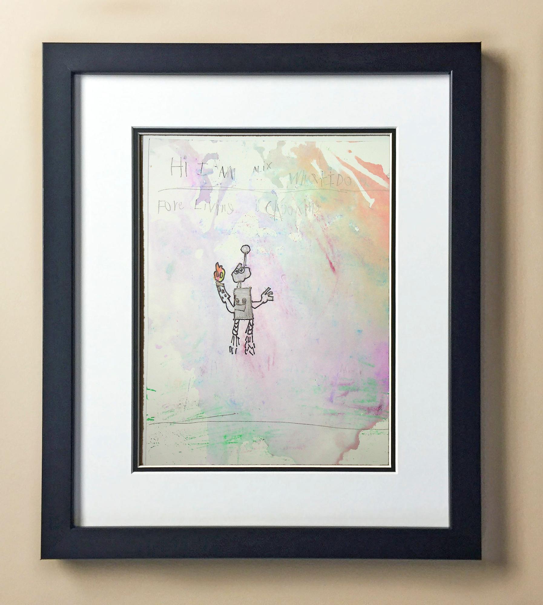 Included with the purchase is the Students Artwork, Frame, double matboard, shatter proof plexiglass, and a ready to hang backerboard with turnbuttons