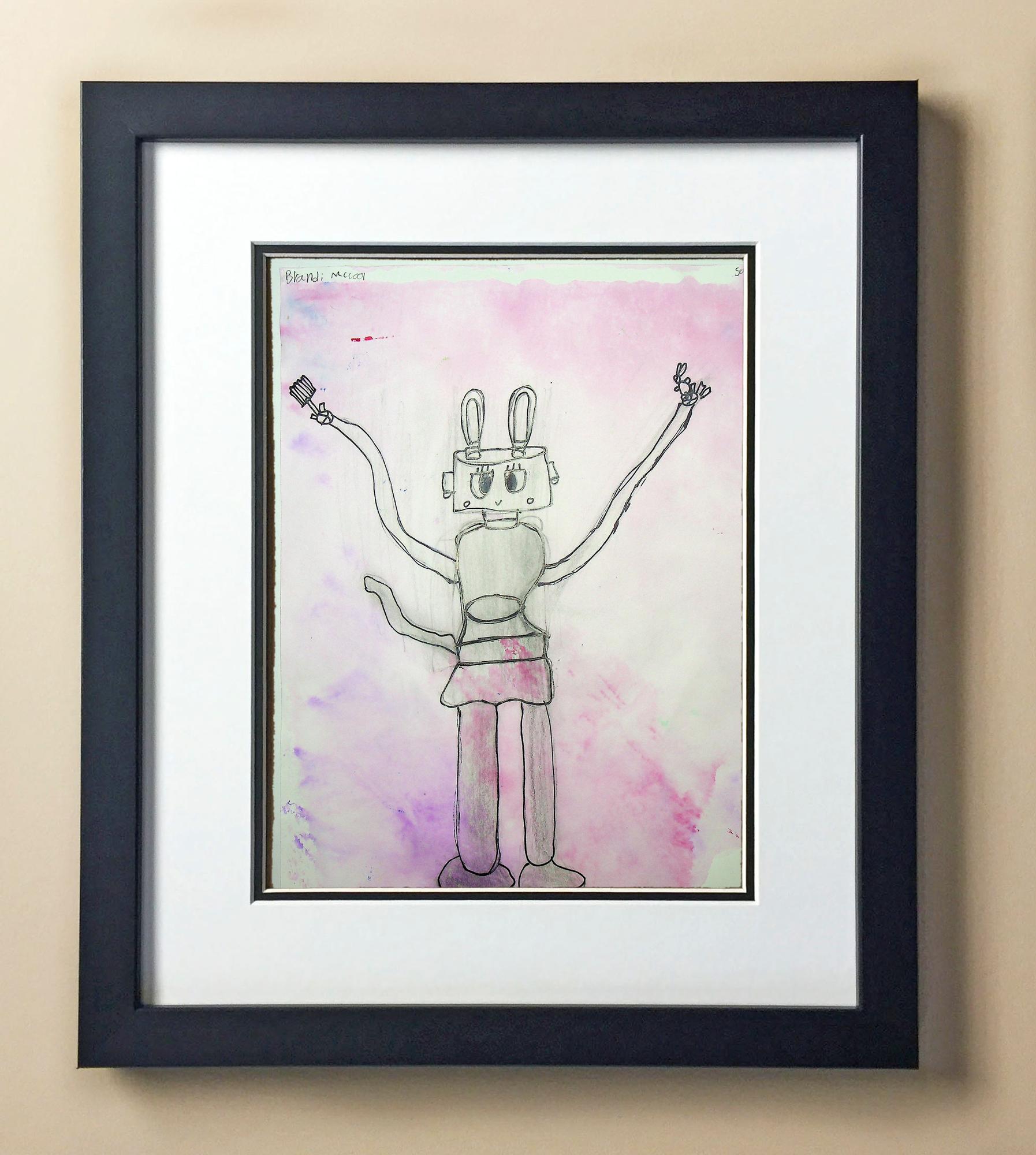 Included with the purchase is the Students Artwork, Frame, double matboard, shatter proof plexiglass, and a ready to hang backerboard with turnbuttons