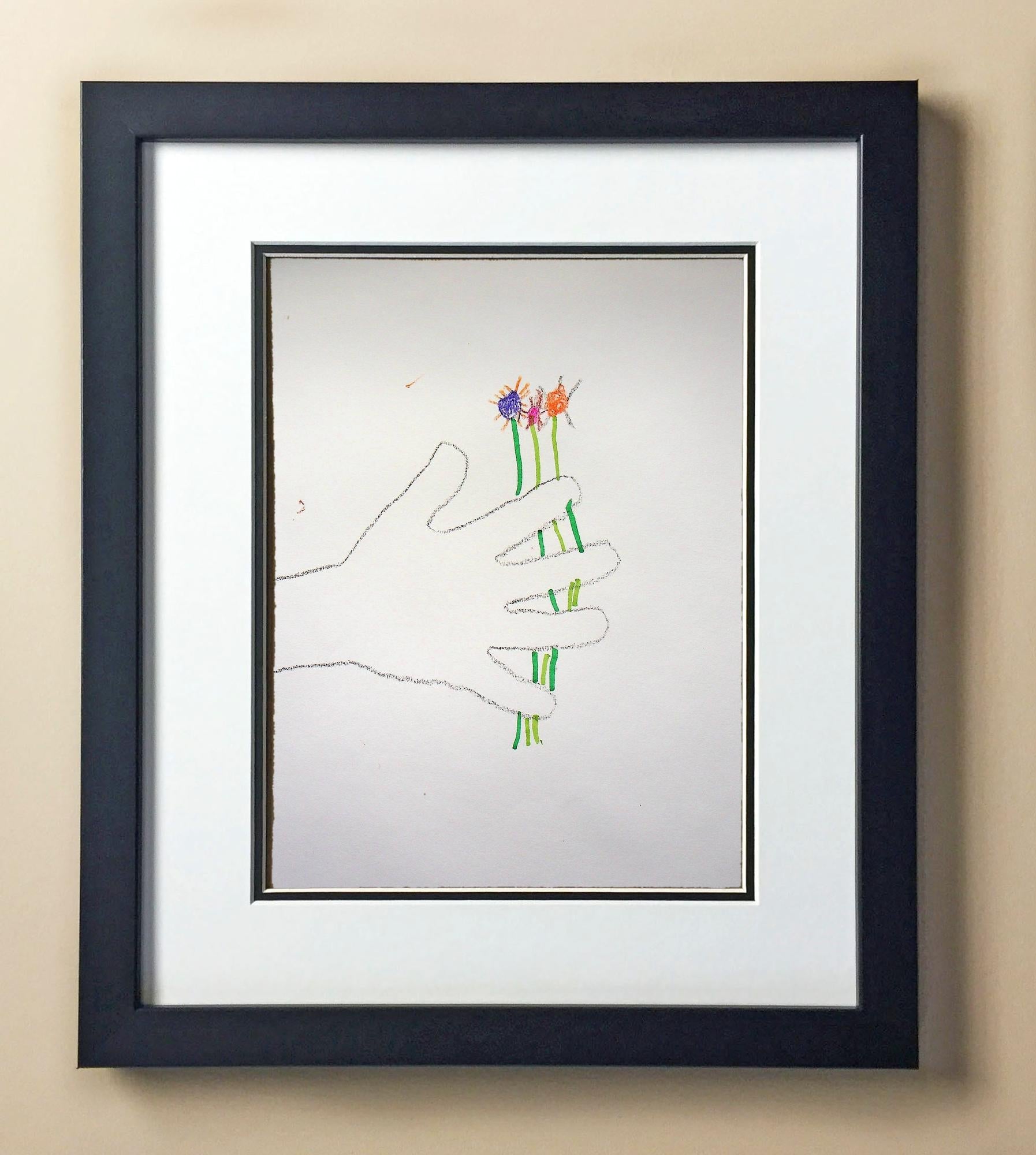 Included with the purchase is the Students Artwork, Frame, double matboard, shatter proof plexiglass, and a ready to hang backerboard with turnbuttons