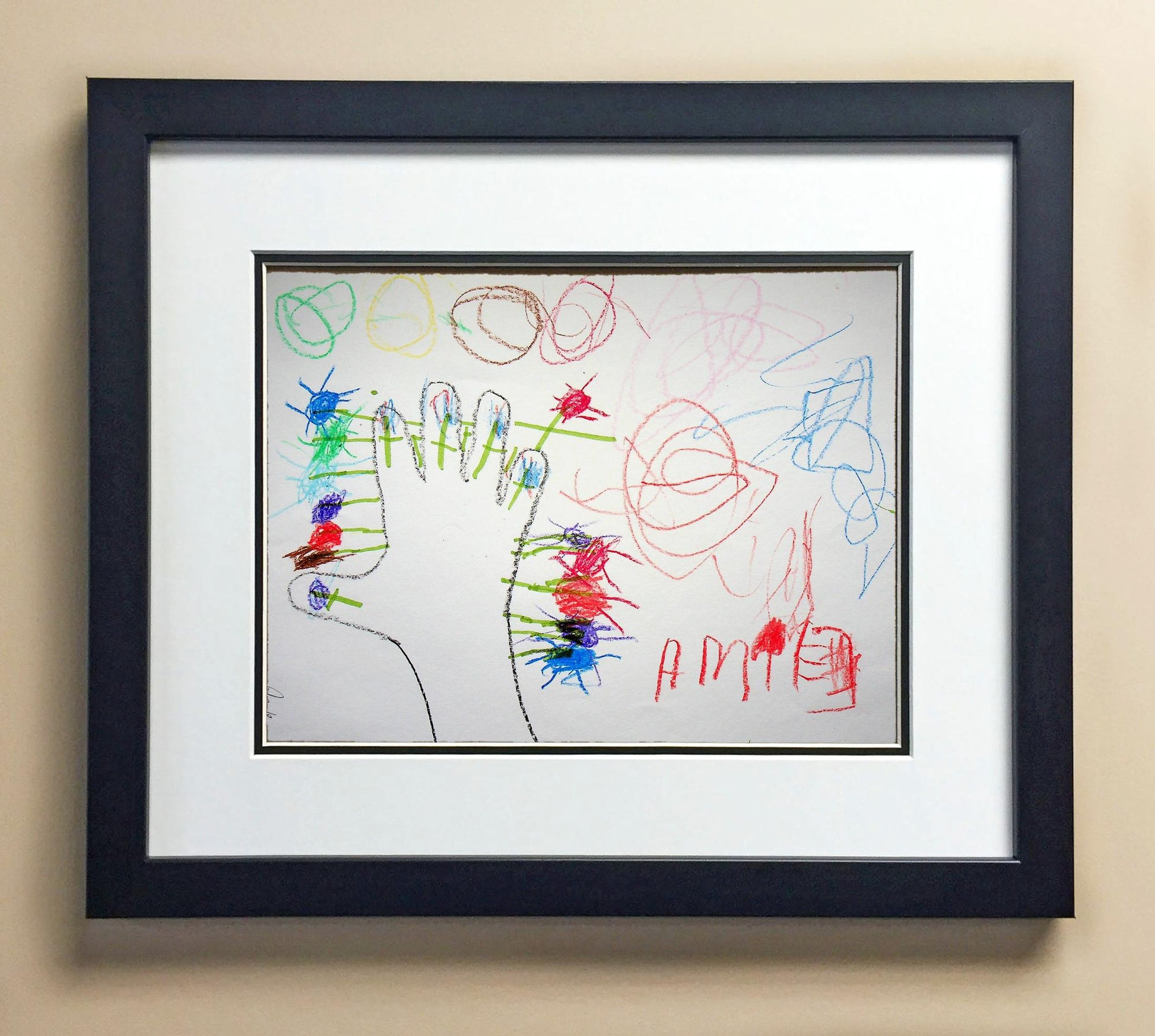Included with the purchase is the Students Artwork, Frame, double matboard, shatter proof plexiglass, and a ready to hang backerboard with turnbuttons