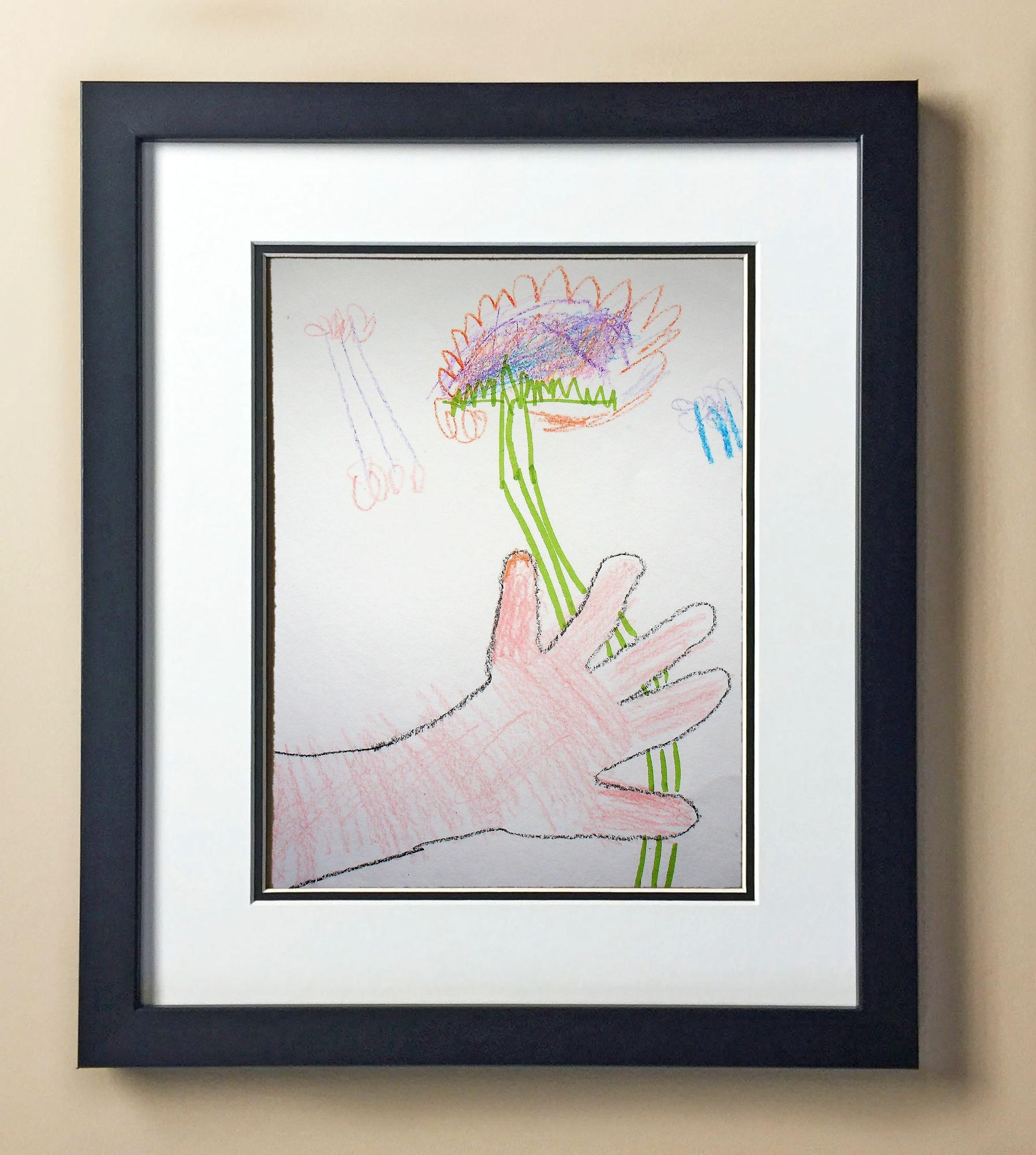 Included with the purchase is the Students Artwork, Frame, double matboard, shatter proof plexiglass, and a ready to hang backerboard with turnbuttons