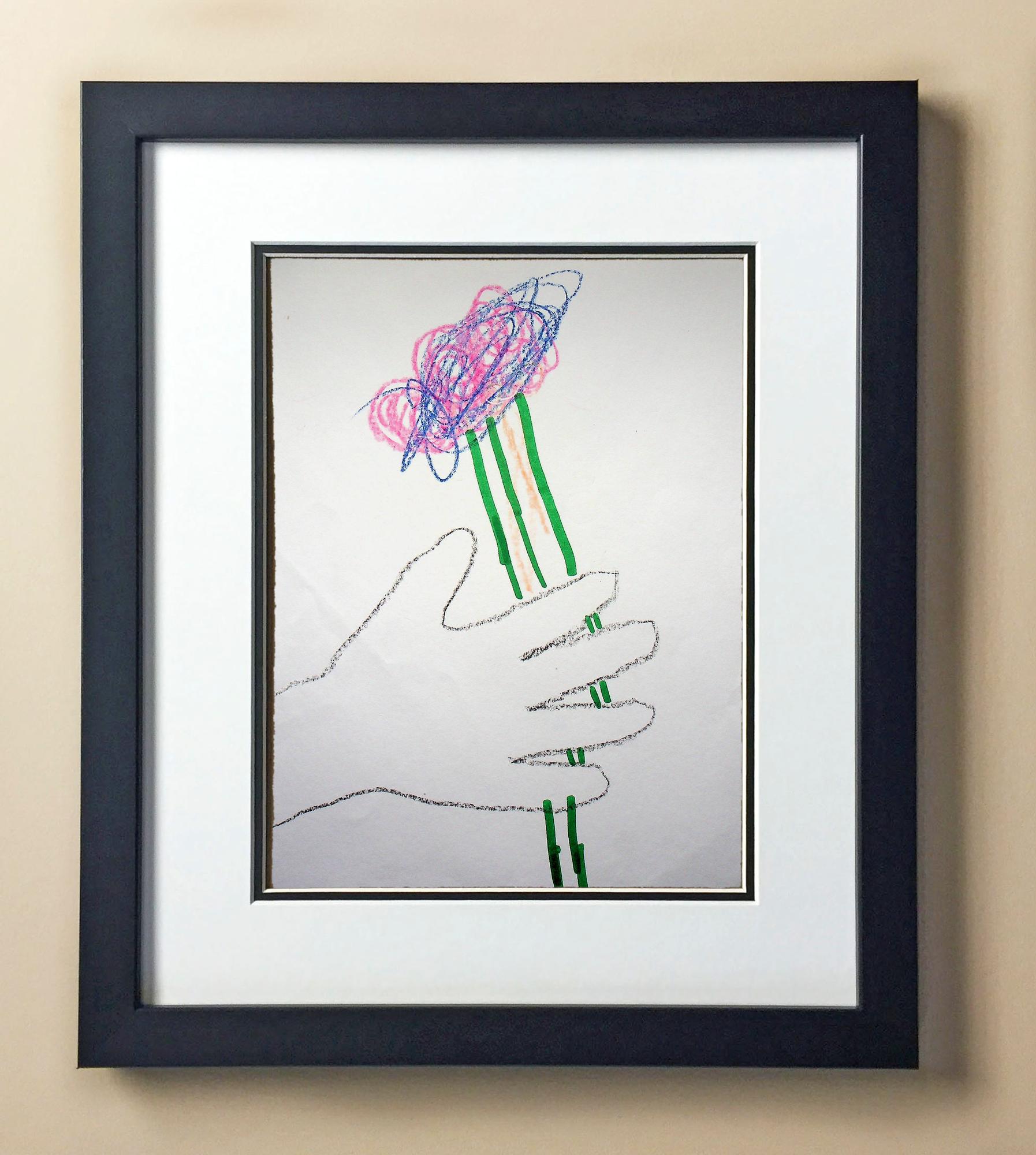 Included with the purchase is the Students Artwork, Frame, double matboard, shatter proof plexiglass, and a ready to hang backerboard with turnbuttons