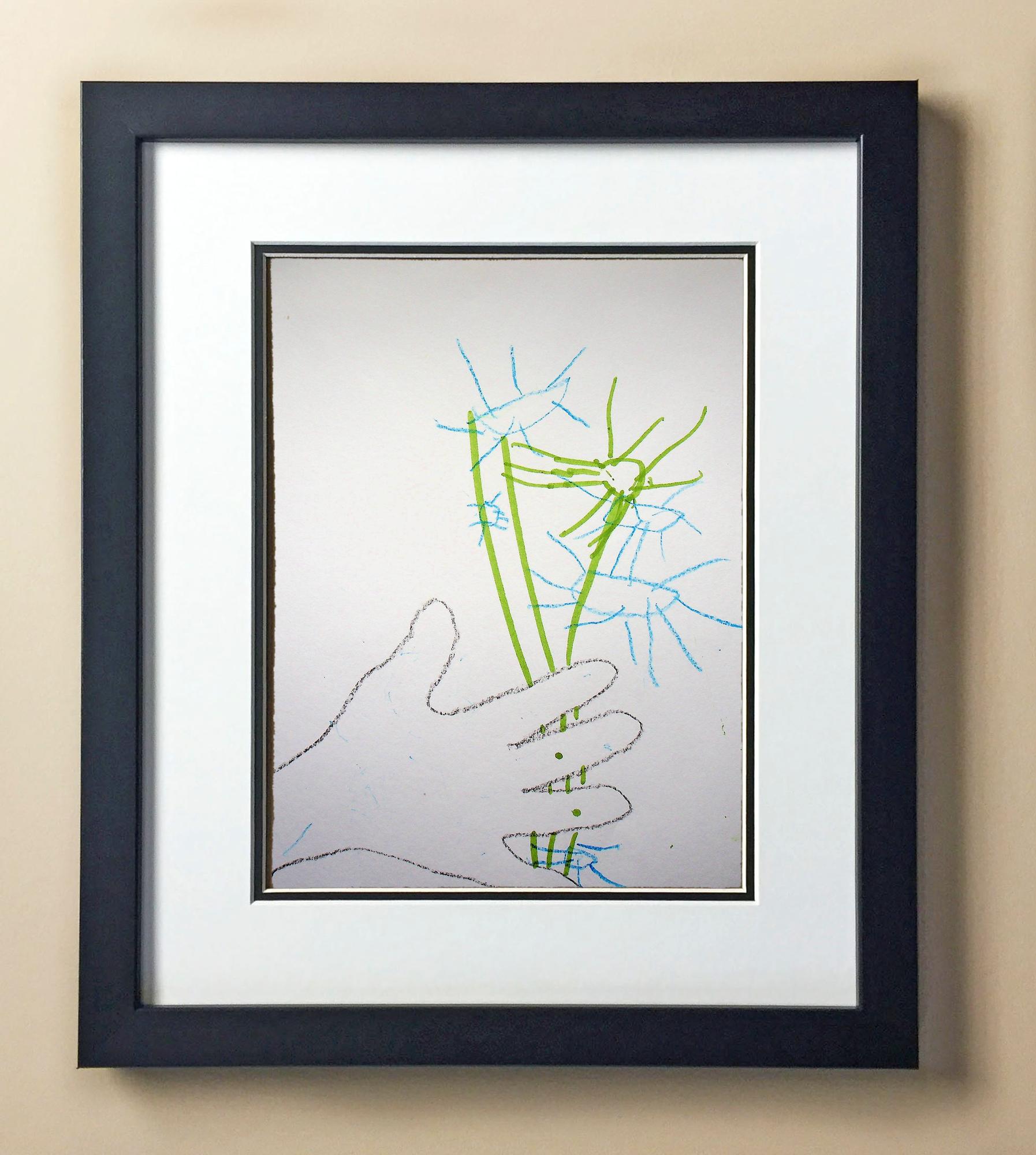 Included with the purchase is the Students Artwork, Frame, double matboard, shatter proof plexiglass, and a ready to hang backerboard with turnbuttons