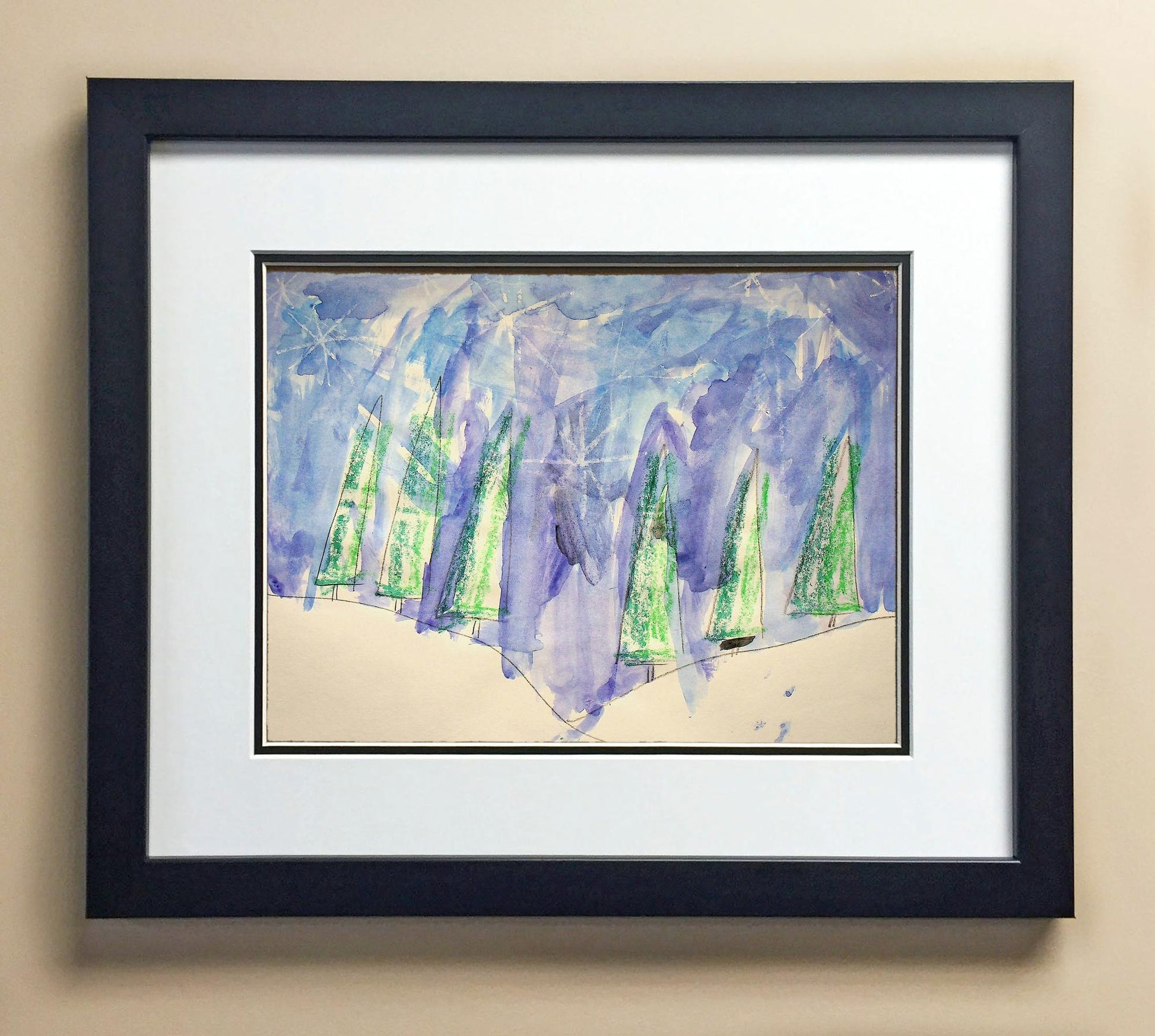 Included with the purchase is the Students Artwork, Frame, double matboard, shatter proof plexiglass, and a ready to hang backerboard with turnbuttons