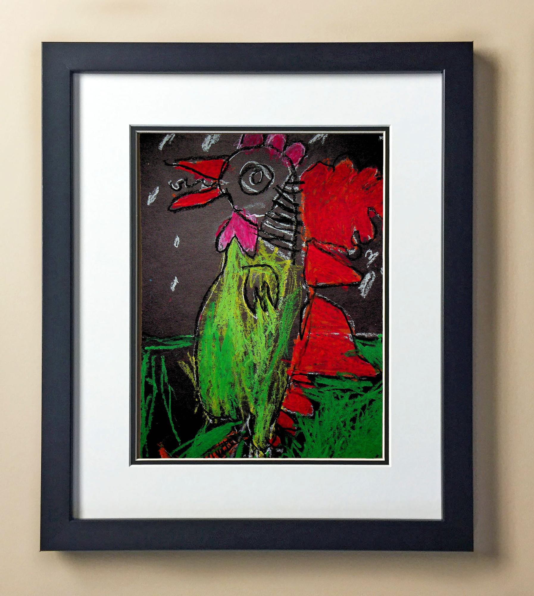 Included with the purchase is the Students Artwork, Frame, double matboard, shatter proof plexiglass, and a ready to hang backerboard with turnbuttons