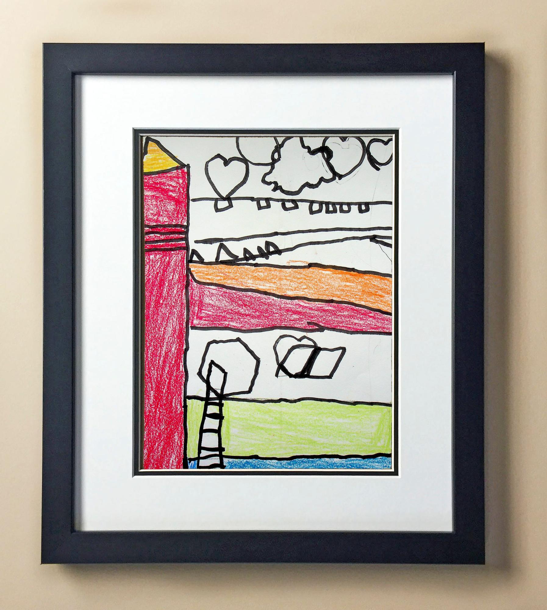 Included with the purchase is the Students Artwork, Frame, double matboard, shatter proof plexiglass, and a ready to hang backerboard with turnbuttons