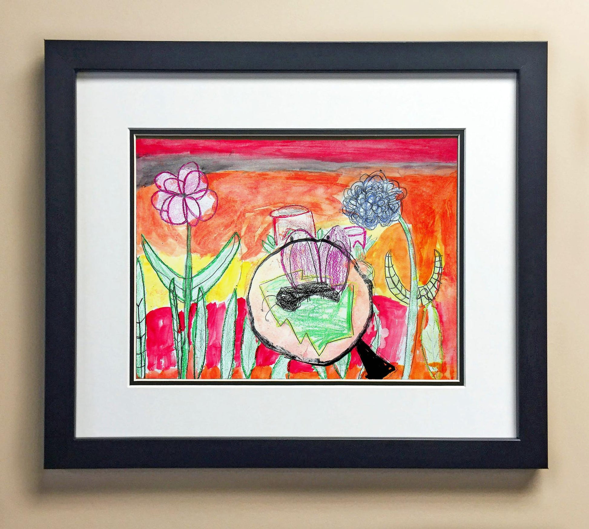 Included with the purchase is the Students Artwork, Frame, double matboard, shatter proof plexiglass, and a ready to hang backerboard with turnbuttons